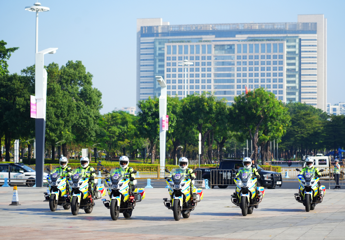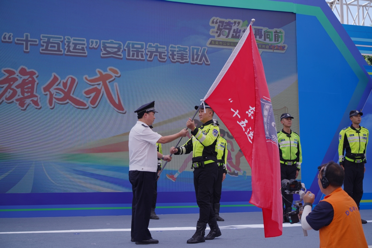 在活动现场,还举行了铁骑“十五运”安保志愿服务队授旗仪式。8名铁骑队员排成“8”字形队列,副市长、市公安局党委书记、局长陈海波将旗帜授予铁骑代表,象征着东莞铁骑接过“十五运”安保重任,展现守护赛事安全的决心。