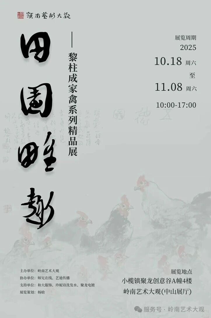 2025年10月18日,由岭南艺术大观主办,师兄在线、艺迪传播协办,并获多家知名企业支持的《田园野趣——黎柱成家禽系列精品展》在中山市小榄镇聚龙创意谷正式开幕。展览汇聚艺术界、企业界与收藏界六十余位嘉宾,展现出艺术与商业融合的鲜明特色。展期将持续至11月8日,全程向公众免费开放。