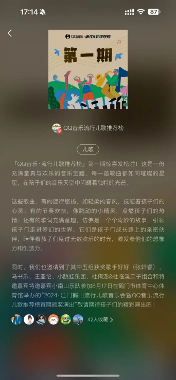 同时,QQ音乐推出业界首创的“QQ音乐流行儿歌推荐榜” ,由专业音乐编辑团队从易懂度、趣味性、传播性、教育意义、情感共鸣等多维度对歌曲综合把关,每月更新并配套长音频节目,为孩子们甄选时代精品,让优质音乐成为启迪心智、陶冶情操的美育课堂。