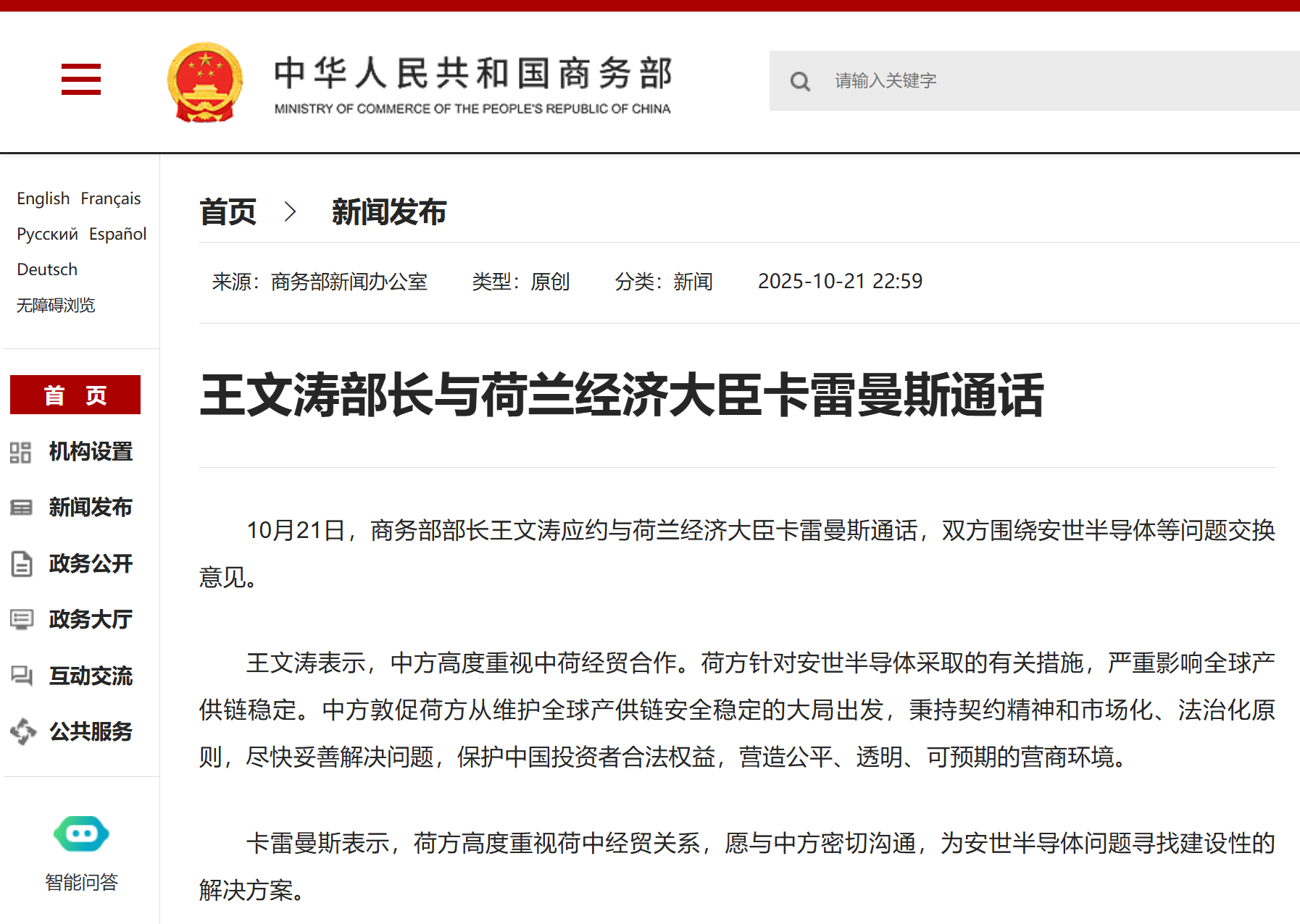 10月21日,商务部部长王文涛应约与荷兰经济大臣卡雷曼斯通话,双方围绕安世半导体等问题交换意见。