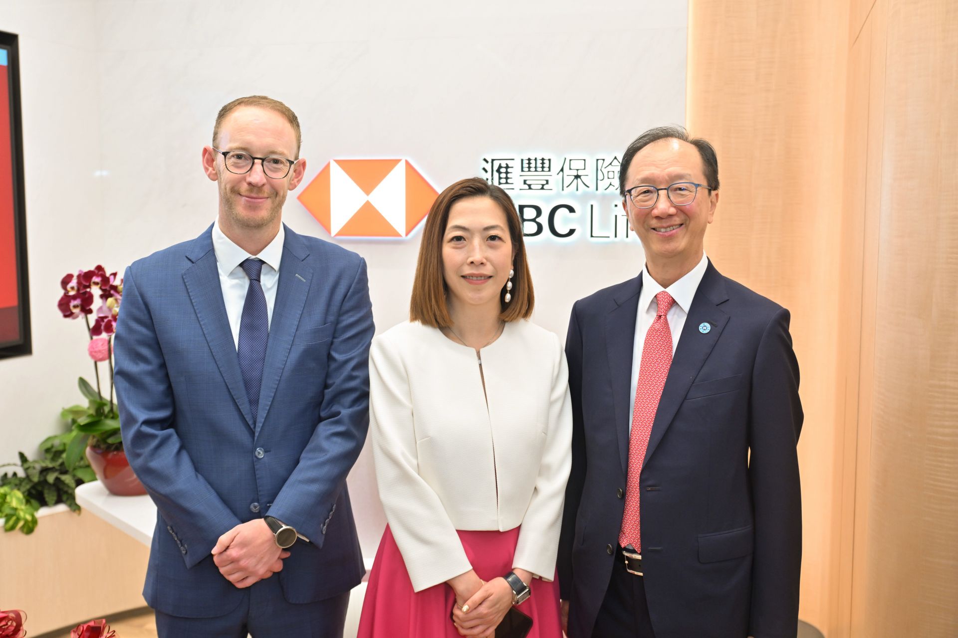 (左至右) 汇丰集团保险业务行政总裁文德华、汇丰保险香港及澳门行政总裁曾佩珊、新风天域集团董事长兼联合创始人梁锦松
