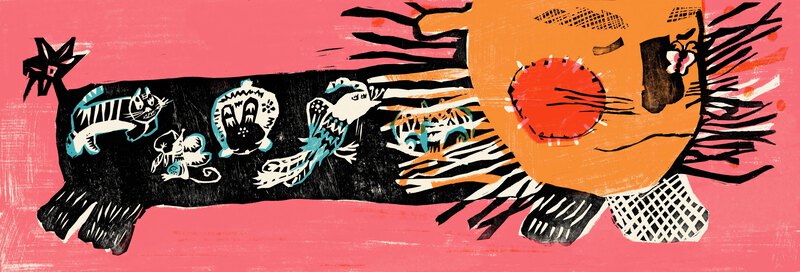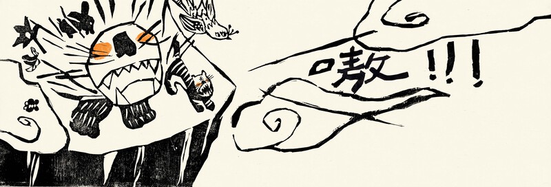创作之初,老师曾给董昕昱提出一个问题:“剪纸变成动物出来玩,回到家再变回剪纸”这一情节应该如何实现呢?董昕昱最初并没有答案,但她带着总能实现的信心,便开始着手创作。一年多时间过去了,她完成版画制作,忽然意识到通过艺术语言,这个问题自然而然地就解决了。故事里并不存在剪纸动物向真实动物进行转化,它们一直都是剪纸。虽然舞狮、真实的动物、环境等都是立体元素,但由于版画的语言将一切都平面化了,这便消弭了故事设定中二维和三维的界限,因此剪纸动物可以在版画的艺术世界里自由玩耍。