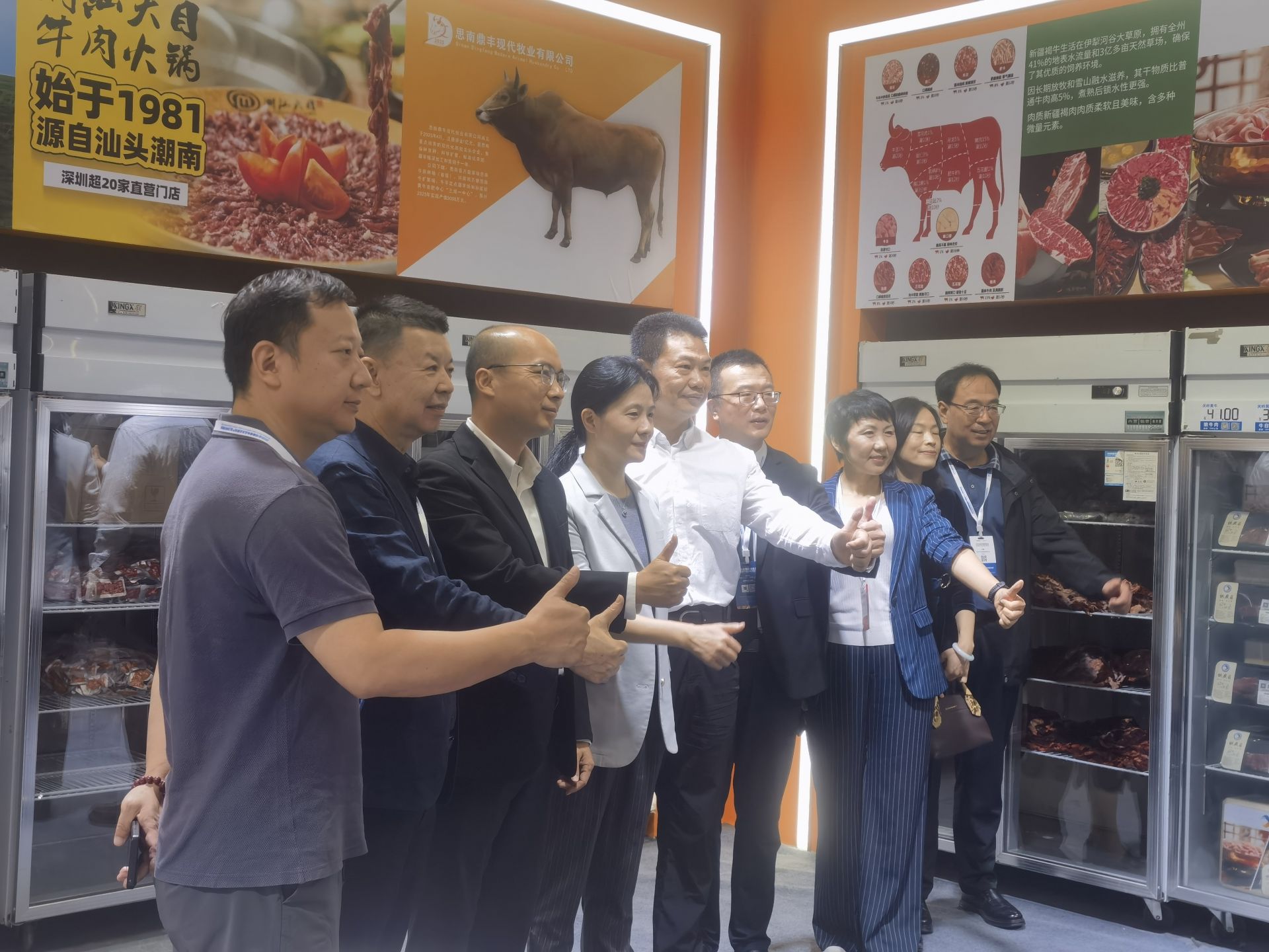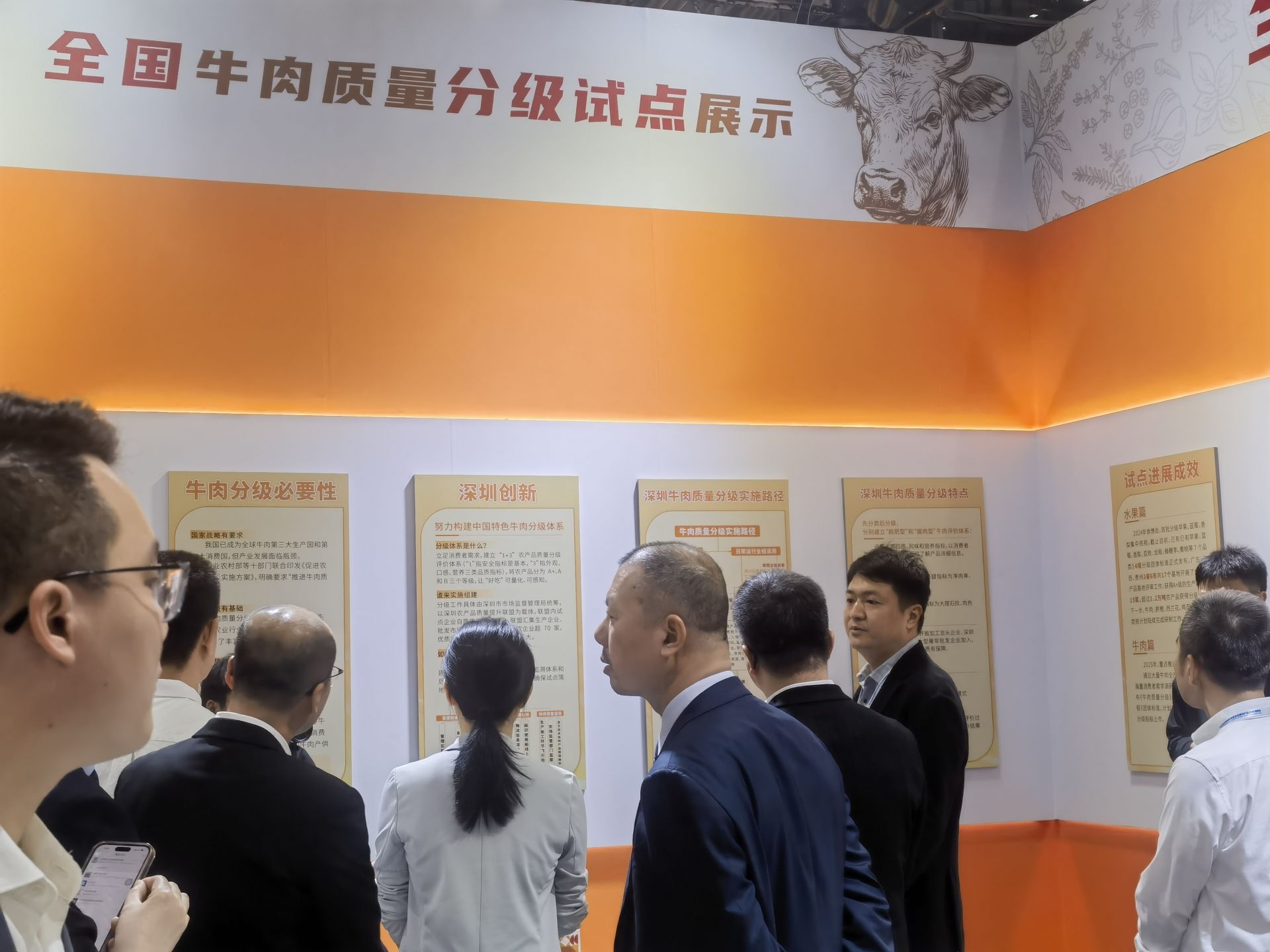 开幕式上,由深圳市场监管局主导的牛肉质量分级团体标准正式发布,为行业质量规范提供新依据。同步举行多个试点企业授牌仪式,推动标准落地实践,彰显展会行业引领作用。深圳市农检中心展台人头攒动,场面火爆,该展台展出的经过分级的优质水果、海水稻和对虾等产品吸引了大批市民的关注,牛肉分级展台同样以展出的优质牛肉吸引不少市民咨询参观。中国副食流通协会会长何继红,市市场监管局局长蔡英权、副局长李颖,市乡村振兴局副局长黄建洪等有关方面负责人出席开幕式并参观展会。