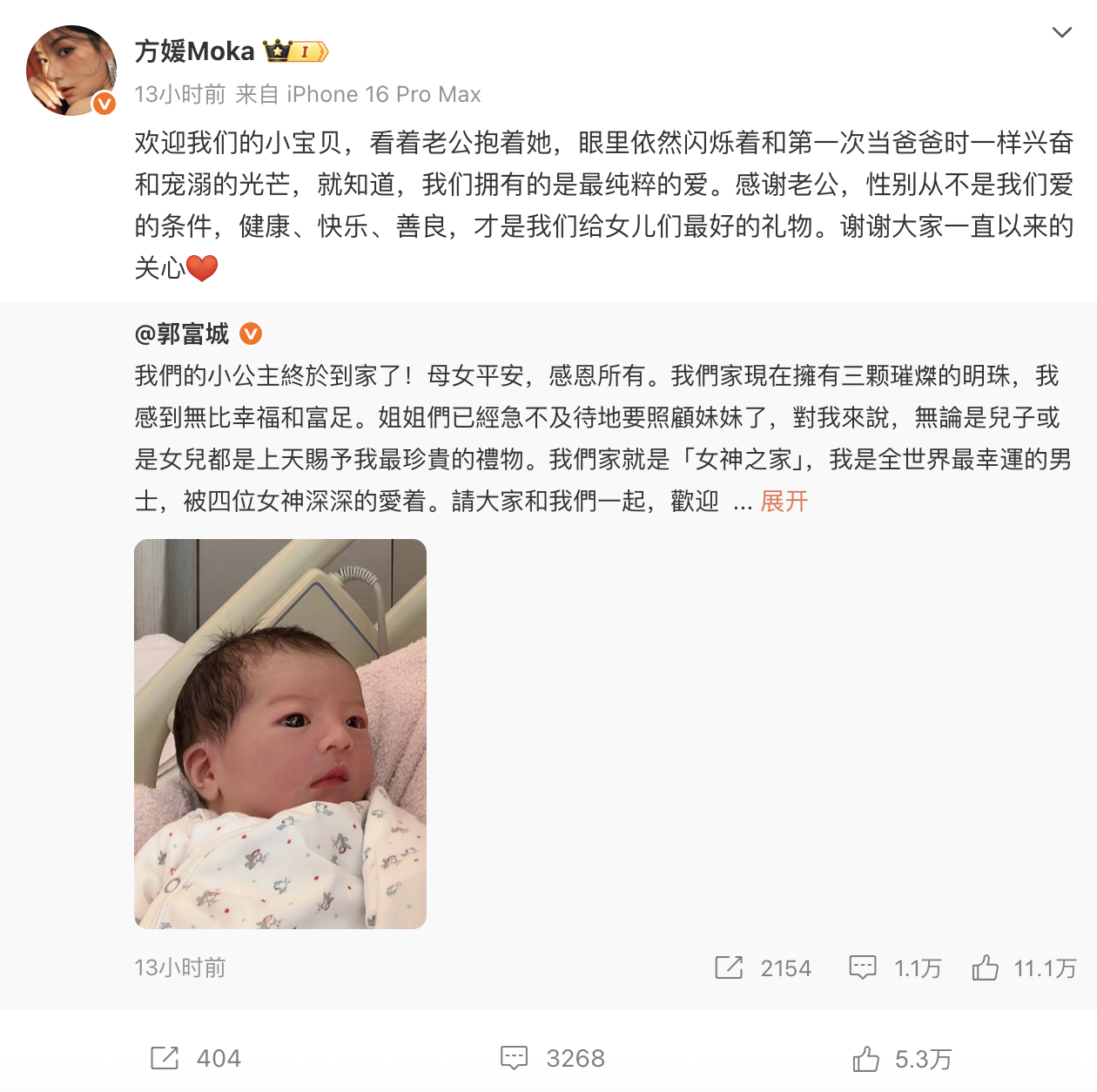 随后方媛转发郭富城微博并说:“欢迎我们的小宝贝,看着老公抱着她,眼里依然闪烁着和第一次当爸爸时一样兴奋和宠溺的光芒,就知道,我们拥有的是最纯粹的爱。感谢老公,性别从不是我们爱的条件,健康、快乐、善良,才是我们给女儿们最好的礼物。谢谢大家一直以来的关心”。