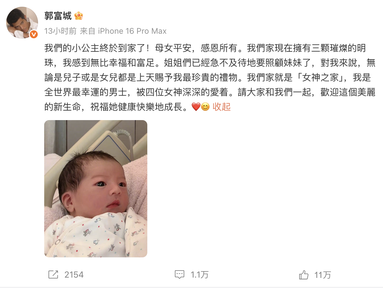 郭富城在微博中说:“我们的小公主终于到家了!母女平安,感恩所有。我们家现在拥有三颗璀璨的明珠,我感到无比幸福和富足。姐姐们已经急不及待地要照顾妹妹了,对我来说,无论是儿子或是女儿都是上天赐予我最珍贵的礼物。我们家就是「女神之家」,我是全世界最幸运的男士,被四位女神深深的爱着。请大家和我们一起,欢迎这个美丽的新生命,祝福她健康快乐地成长”。