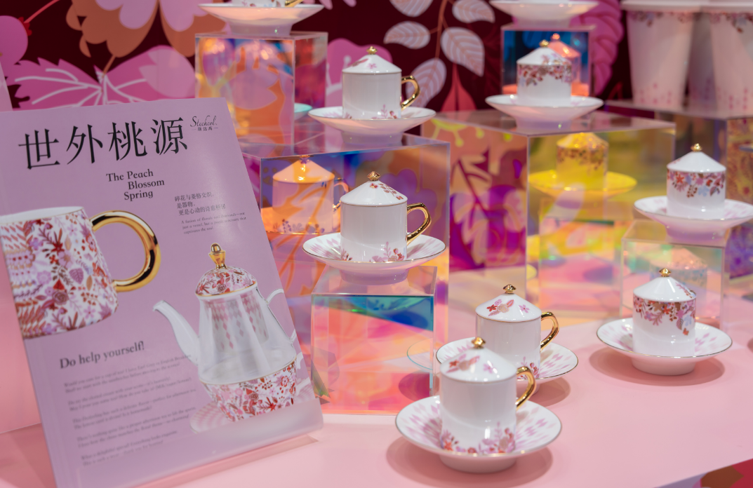 此外,“世外桃源”与“青雪”两大系列,更是斯达高对“东方设计语言”的深度诠释。“世外桃源”系列以粉色浪漫美学为基调,设计师将对理想栖居的想象凝于瓷面,用柔和釉色与简约线条勾勒出静谧意境,旨在让使用者于喧嚣日常中,通过器物重拾“世外桃源”般的恬淡与美好;“青雪”系列则以清代宫廷画《万有同春》为灵感源头,突破性地将“百花竞放”的生机与“冬日雪色”的清冷相融,天青釉色打底、雪白纹饰铺陈、金线勾勒点睛,生动再现“雪中繁花傲立枝头”的诗意画面,让民族文化的根脉与世界审美的潮流实现了跨时空对话。