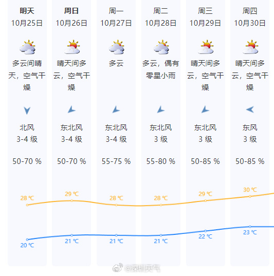 深圳市气象台预计,25-26日深圳多云到晴天,空气干燥,沿海、高地和海区最大阵风6级左右,气温回升,25日气温20-28℃;27-28日多云,局地偶有零星小雨,气温略降。展望29-30日晴天间多云,气温回升。天气趋于干燥,建议做好用火用电安全管理工作。