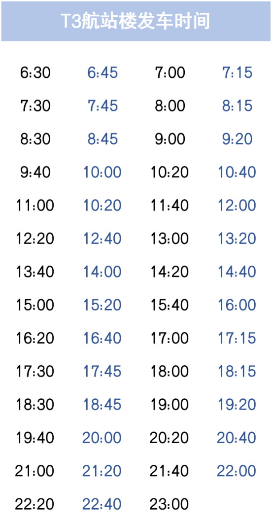 T3航站楼免费公交专线:线路单程约6公里,用时约15分钟,发车间隔为15-20分钟。