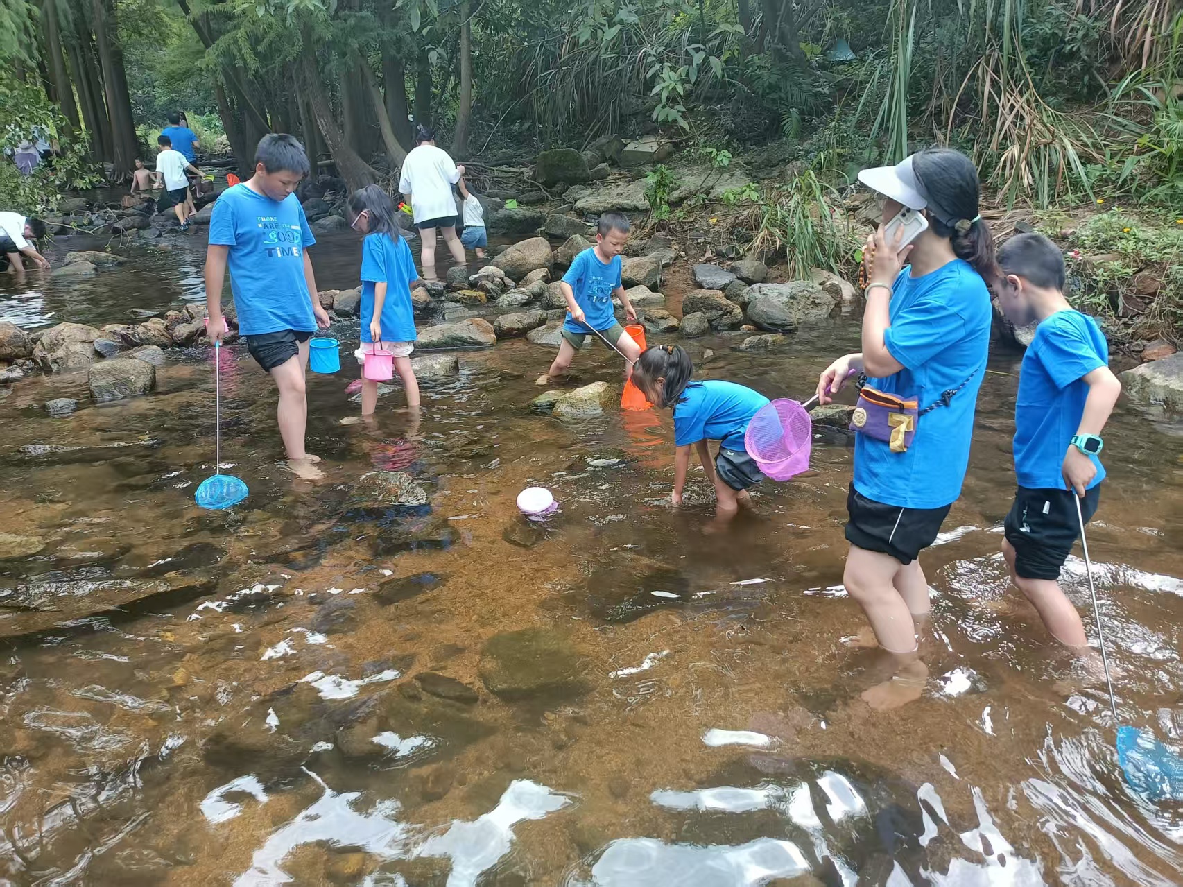 行至溪流区域,活动进入核心探索环节。在工作人员的引导下,青少年们手持捞网与生态记录本,小心翼翼地观察溪流中的小鱼、小虾、螃蟹与蝌蚪,聆听关于水生生物生活习性、生存环境及生态系统作用的讲解。孩子们蹲在溪岸边,认真记录生物的形态特征与行为习惯,不时与家长分享发现的“小惊喜”——“妈妈你看,这只蝌蚪好像长出后腿了!”“这条小鱼的颜色和石头特别像,差点找不到它!” 鲜活的自然场景,让青少年对“生态平衡”有了更直观的认知。