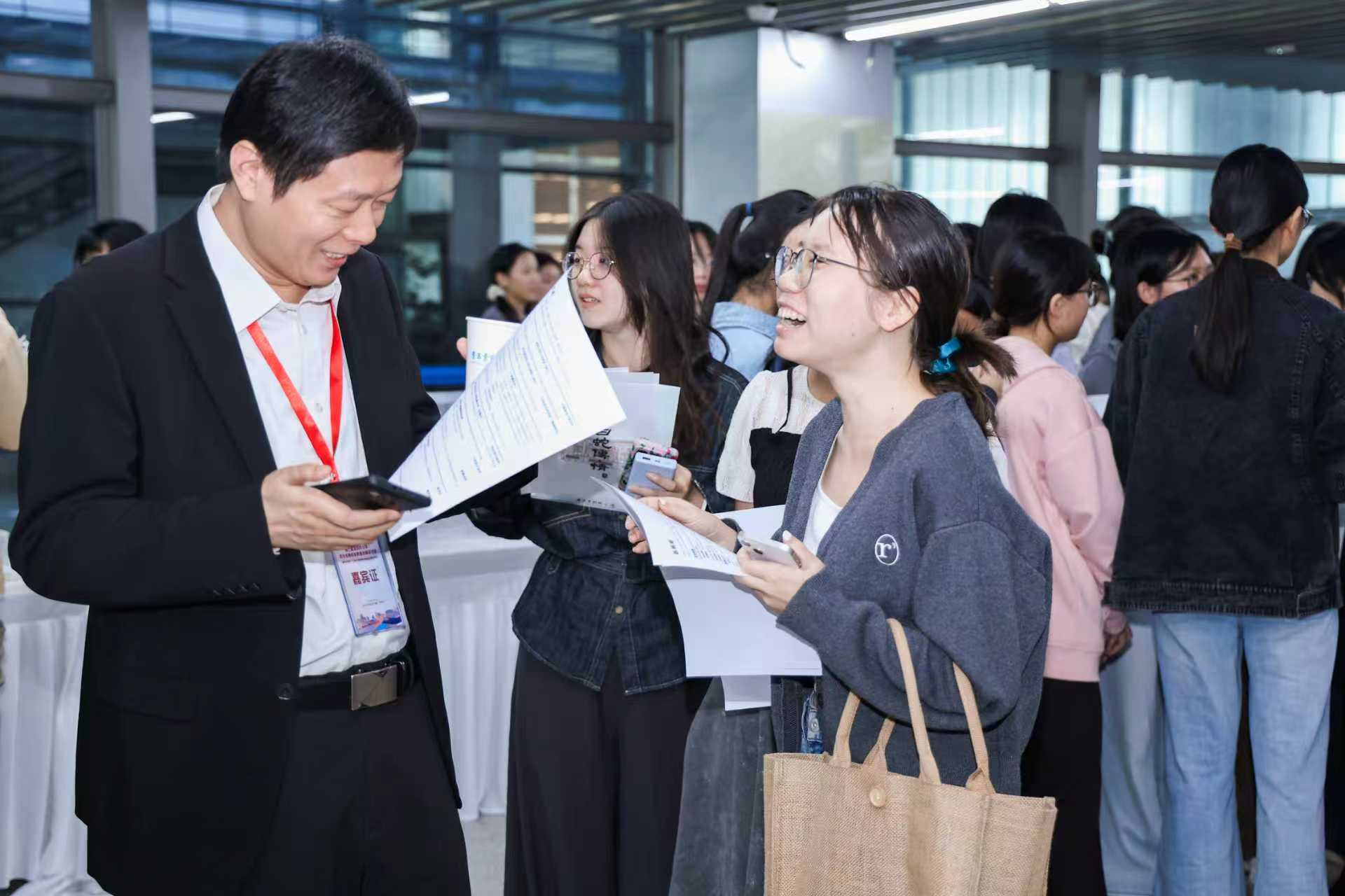 研讨会举办期间,来自多个学院的两百余名学生齐聚汇星楼报告厅,带着各自的简历、作品集、教学设计成果和问题,把前来参会的中小学校长,以及名师校友代表“团团围住”。有的学生现场向“大师哥大师姐”请教教师面试技巧和学校招考情况;有的同学直接投递简历,与校长面对面沟通表达实习意愿;更有辅导员亲自上阵,根据学校的用人需求,精准推荐优秀应届毕业生……
