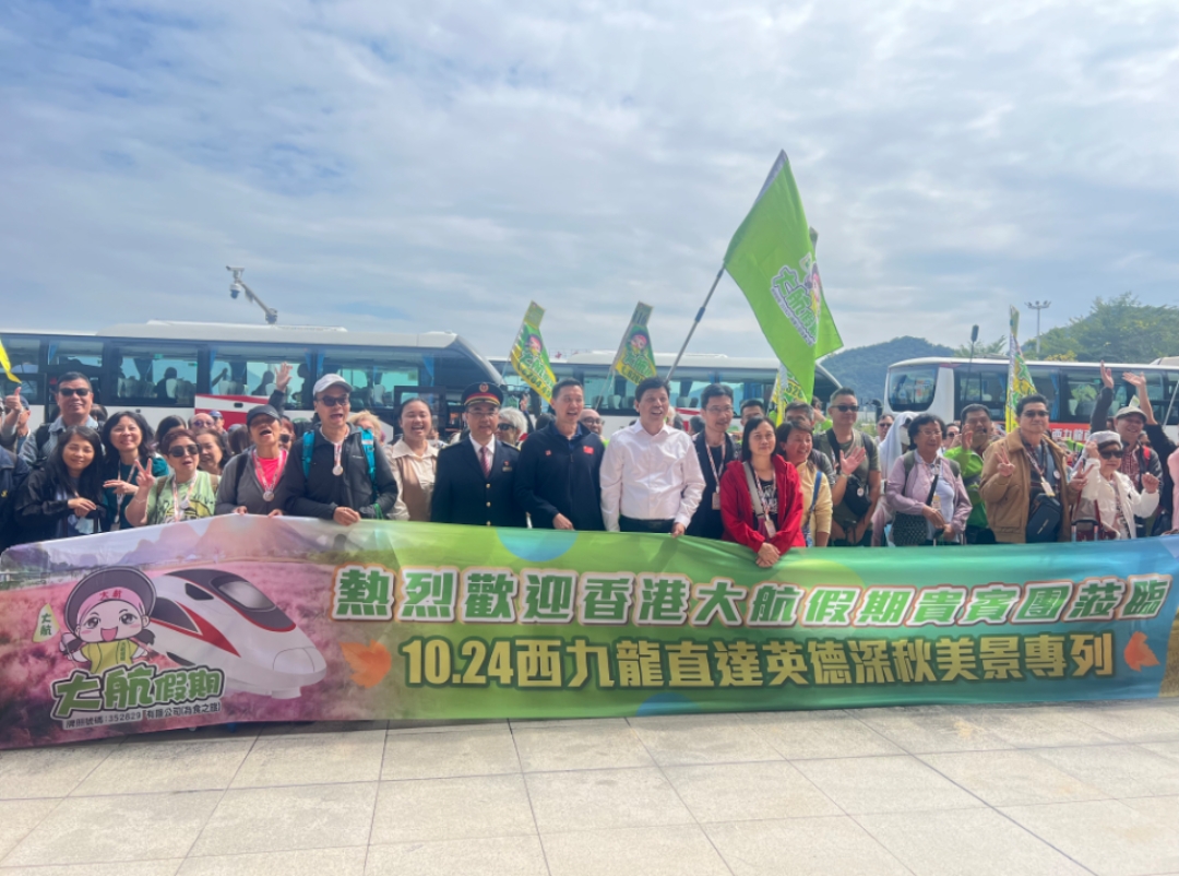 清远市文化广电旅游体育局副局长莫鼎宽及英德市文化广电旅游体育局局长肖贞响亲临现场迎接,肖贞响表示,这趟专列不仅是连接西九龙与英德的“交通线”,更是两地文化交融、旅游合作的“黄金桥梁”,希望香港游客能在英德慢品深秋风光,留下美好回忆。