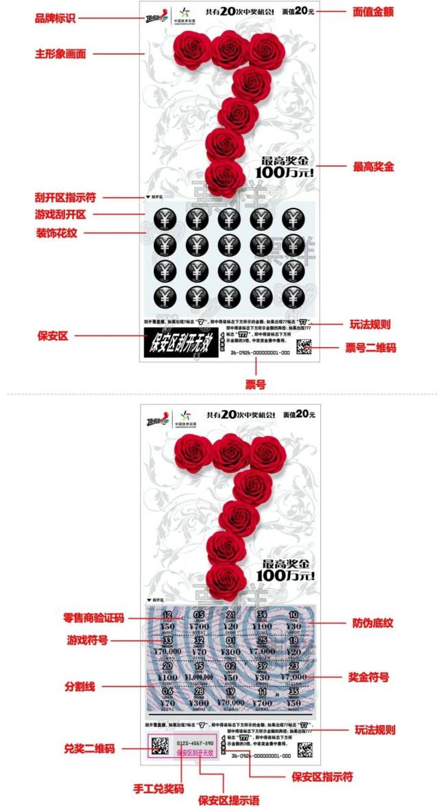 票面还会印有体彩+顶呱刮logo标识以及这张票的面值金额,刮开游戏区域的覆盖膜后会看到防伪底纹,而且游戏符号、奖金标志清晰易辨别。