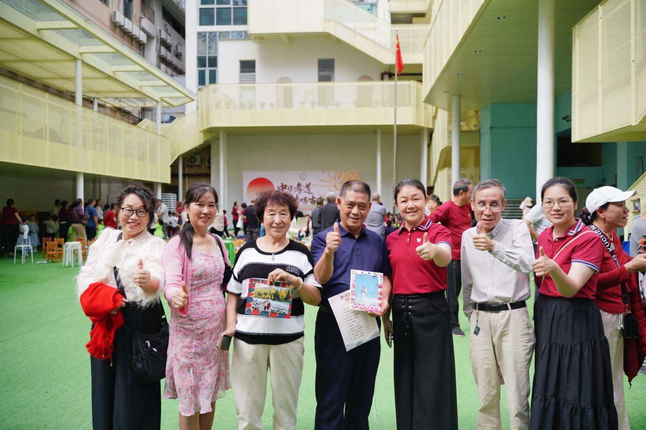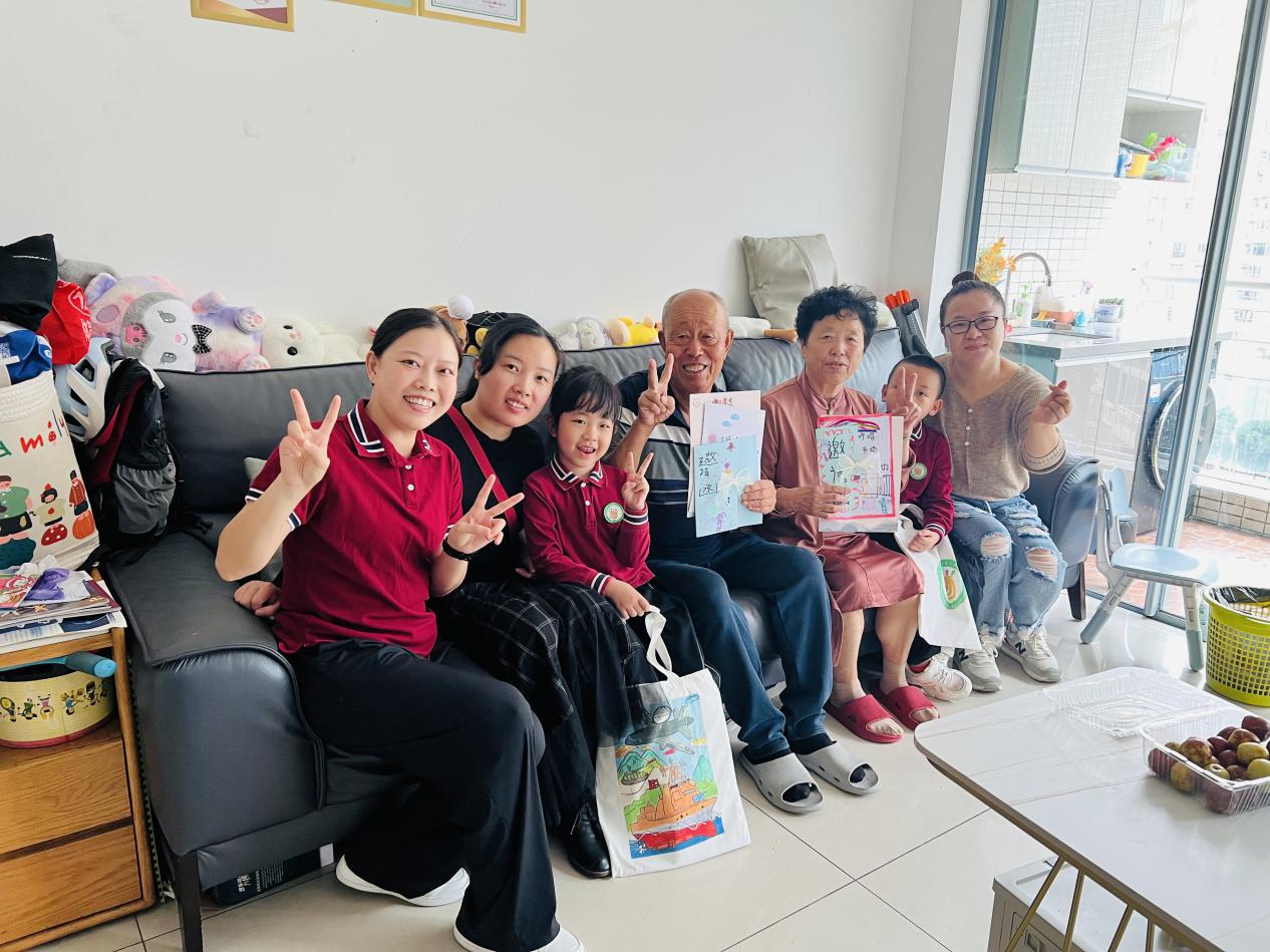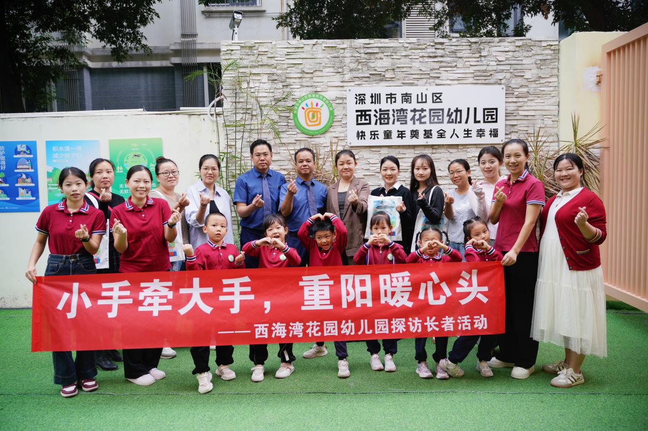 重阳节前一天,在老师、家长和小区物业的陪同下,幼儿代表们走进配套小区西海湾花园,看望独居长者。孩子们手捧着自己手绘的帆布袋和自制的邀请函,如同一个个小天使,送去温暖的祝福。老人们也亲切地和孩子们分享着他们在深圳奋斗耕耘的故事,那一段段充满拼搏与汗水的岁月,仿佛为孩子们打开了一扇通往过去的大门。孩子们听得聚精会神,小小的心灵里也种下了坚韧与感恩的种子。