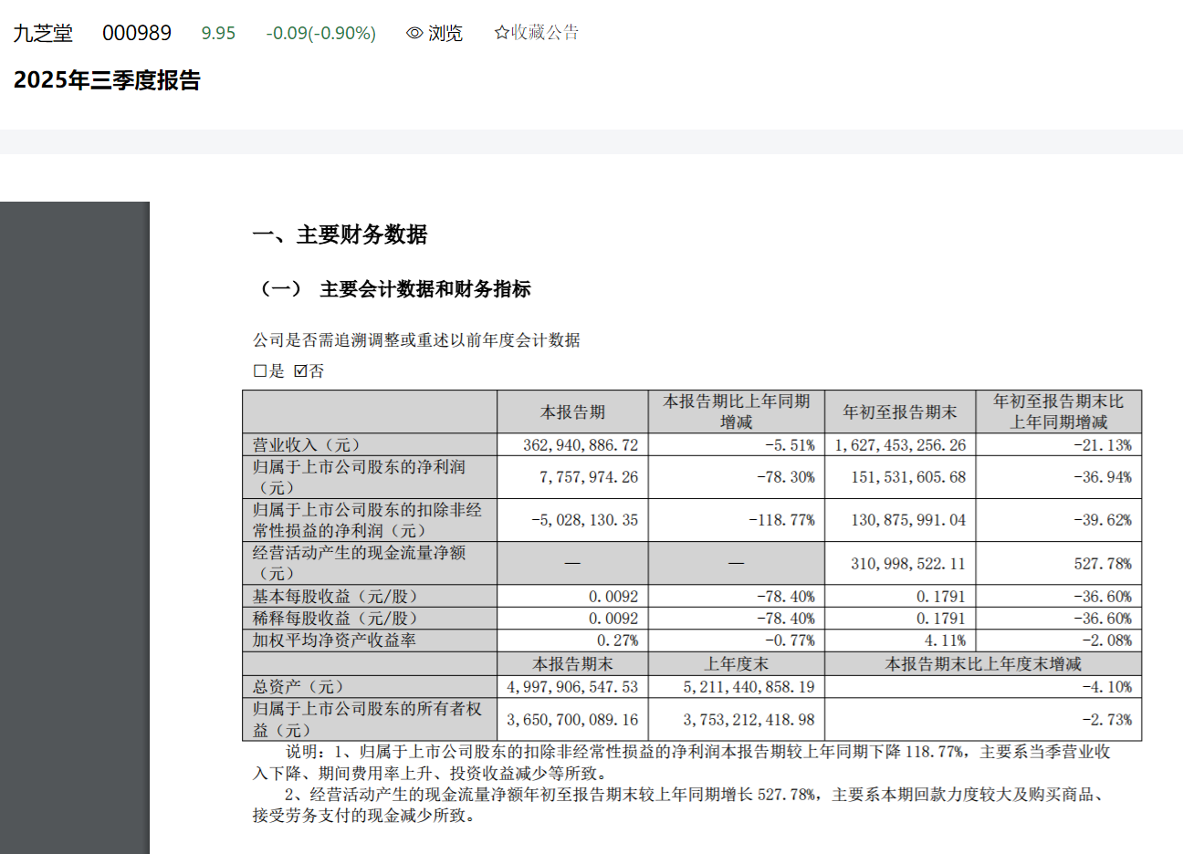 根据公告,今年第三季度九芝堂实现营业收入3.63亿元,同比减少5.51%;归属母公司股东的净利润为775.8万元,同比减少78.3%。而今年上半年公司营业收入同比下滑24.71%,净利润同比下降29.71%。在第三季度业绩下滑的拖累下,今年前三季度九芝堂实现营业收入16.27亿元,同比减少21.13%;归属母公司股东的净利润为1.52亿元,同比减少36.94%。