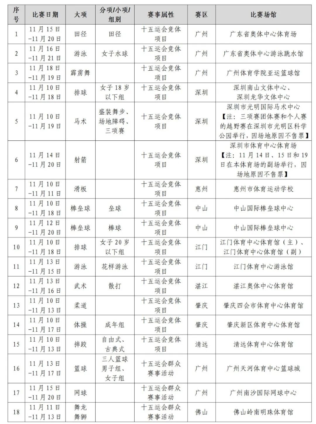本批次开售的18个体育项目,既包括专业竞技赛事,也纳入群众参与的高水平赛事活动。赛事将在广东赛区的广州、深圳、佛山、惠州、中山、江门、湛江、肇庆、清远9个城市举办。