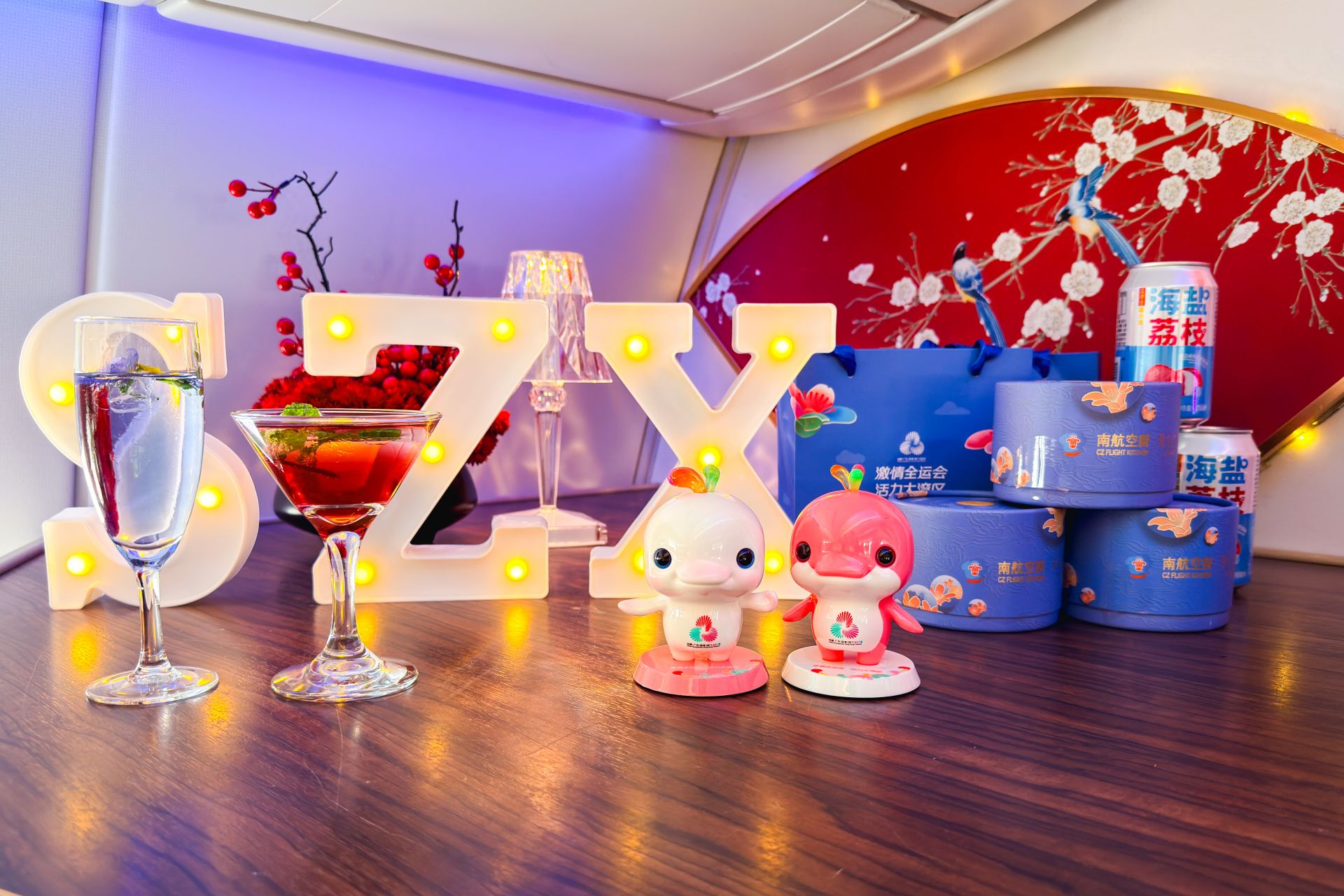 “活力湾区号”客舱内部以“喜上眉梢”为设计主题,锦鲤、木棉花等装饰元素呼应赛事举办地岭南文化,营造出浓郁体育盛会氛围。据悉,南航每周在该架飞机上举办主题航班活动,定制十五运会主题广播词,推出季节限定特饮及主题甜品,让旅客在万米高空感受赛场激情。此外,南航全新升级“云端木棉”餐具与“御风飞行”香氛,配合A350动态情景灯光,共同营造沉浸式十五运主题客舱体验。