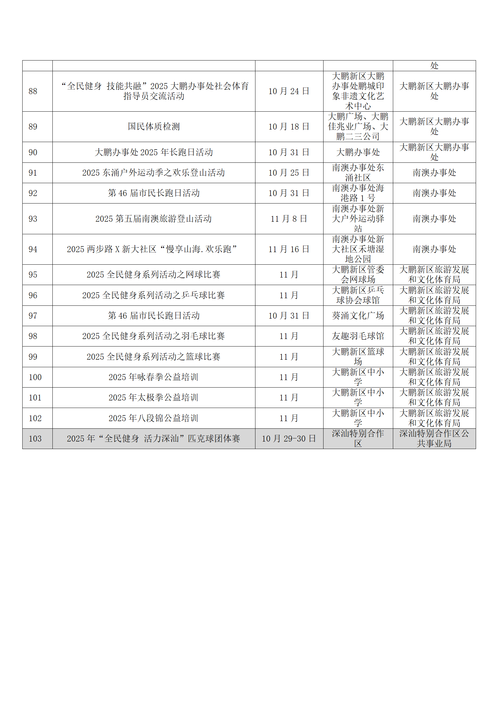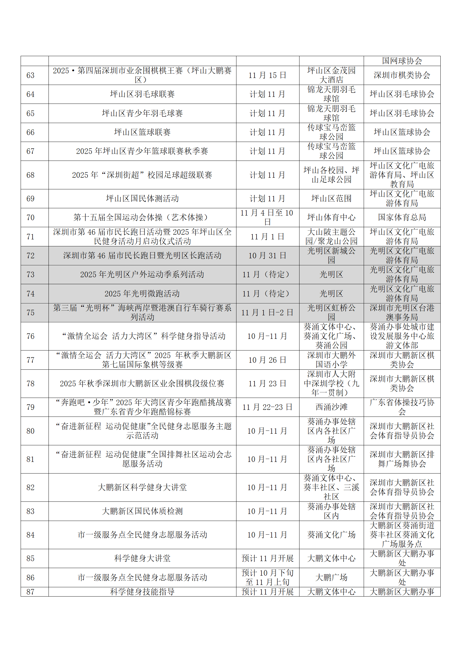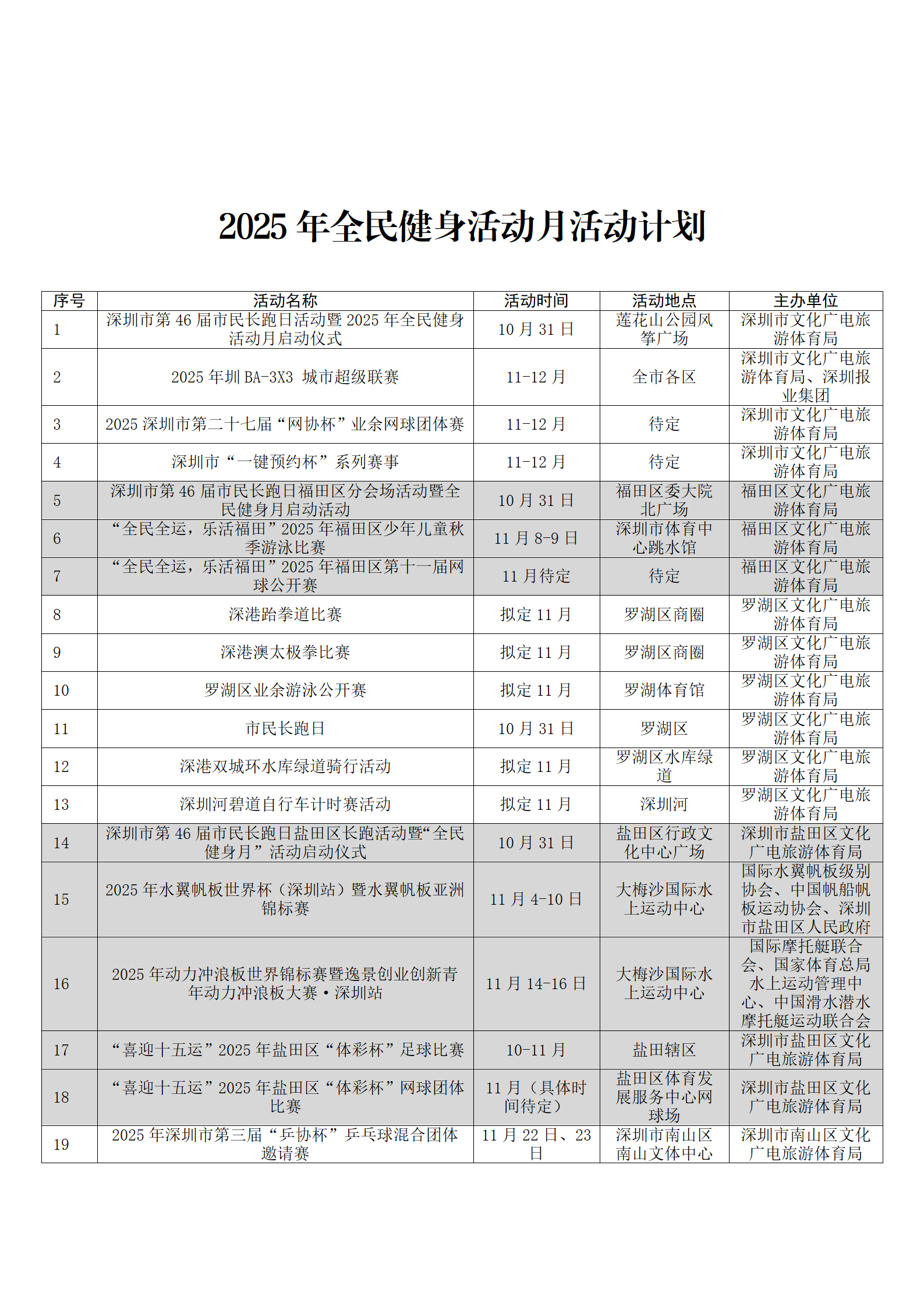 全民健身活动月和市民长跑日是《深圳经济特区促进全民健身条例》法定的全民健身活动,体现深圳全民健身事业发展法治化、规范化的重要标志。为推动全民健身赛事活动蓬勃发展,营造第十五届全运会和残特奥会期间“全民享健身,喜迎十五运”的浓厚氛围,深圳计划在2025年全民健身月期间举办103场活动,涵盖足球、篮球、网球、羽毛球、乒乓球、徒步等赛事,以及国民体测与健身指导等系列活动。全市各区共有120个体育场馆免费或优惠向公众开放,旨在满足广大市民的健身需求。