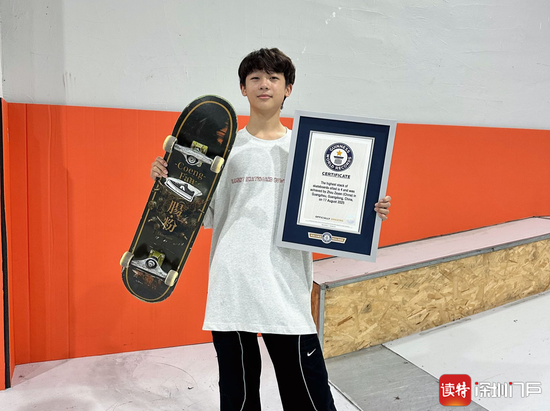 近日,来自广东的14岁初中生周泽延凭借一项创新的滑板动作,成功创造“双脚带板跳上最多的叠放的滑板”吉尼斯世界纪录。