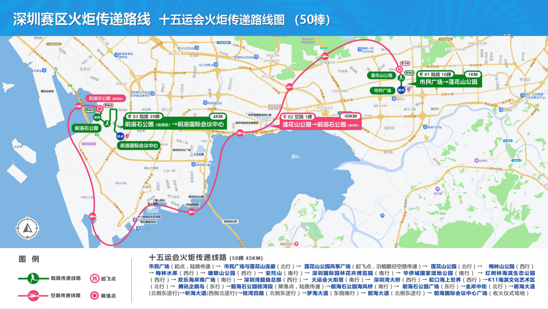 市民广场(起点,陆路传递)→市民广场与莲花山连廊(北行)→莲花山公园风筝广场(起飞点,沿鲲鹏径空路传递)→莲花山公园(北行)→梅林山公园(西行)→梅林水库(西行)→塘朗山公园(西行)→安托山(南行)→深圳国际园林花卉博览园(南行)→华侨城国家湿地公园(南行)→红树林海滨生态公园(西行)→欢乐海岸南广场(南行)→深圳湾超级总部(西行)→大运会火炬塔(南行)→深圳湾大桥(西行)→蛇口海上世界(西行)→K11海滨文化艺术区(北行)→腾讯企鹅岛(东行)→前海石公园桂湾段(降落点,陆路传递)→前海石公园海风桥(南行)→前海石公园广场(东行)→金岸中街(北行)→前海大道(北侧东逆行)→听海大道(西侧北逆行)→桂湾四路(北侧东逆行)→梦海大道(东侧南行)→前海大道(北侧东逆行)→前海国际会议中心广场(收火仪式场地)