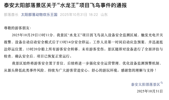 10月31日,泰安太阳部落景区发布关于“水龙王”项目飞鸟事件的通报:10月29日13时11分,我景区“水龙王”项目因飞鸟误入设备安全监测区域,触发光电开关报警,设备自动启动安全模式后于13时14分安全停运。工作人员第一时间启动应急预案,并迅速抵达停运位置,13时20分船上所有游客安全转移,未有游客受伤。景区随即对设备进行了全面评估与检查,确认安全后,项目已恢复正常运行。
