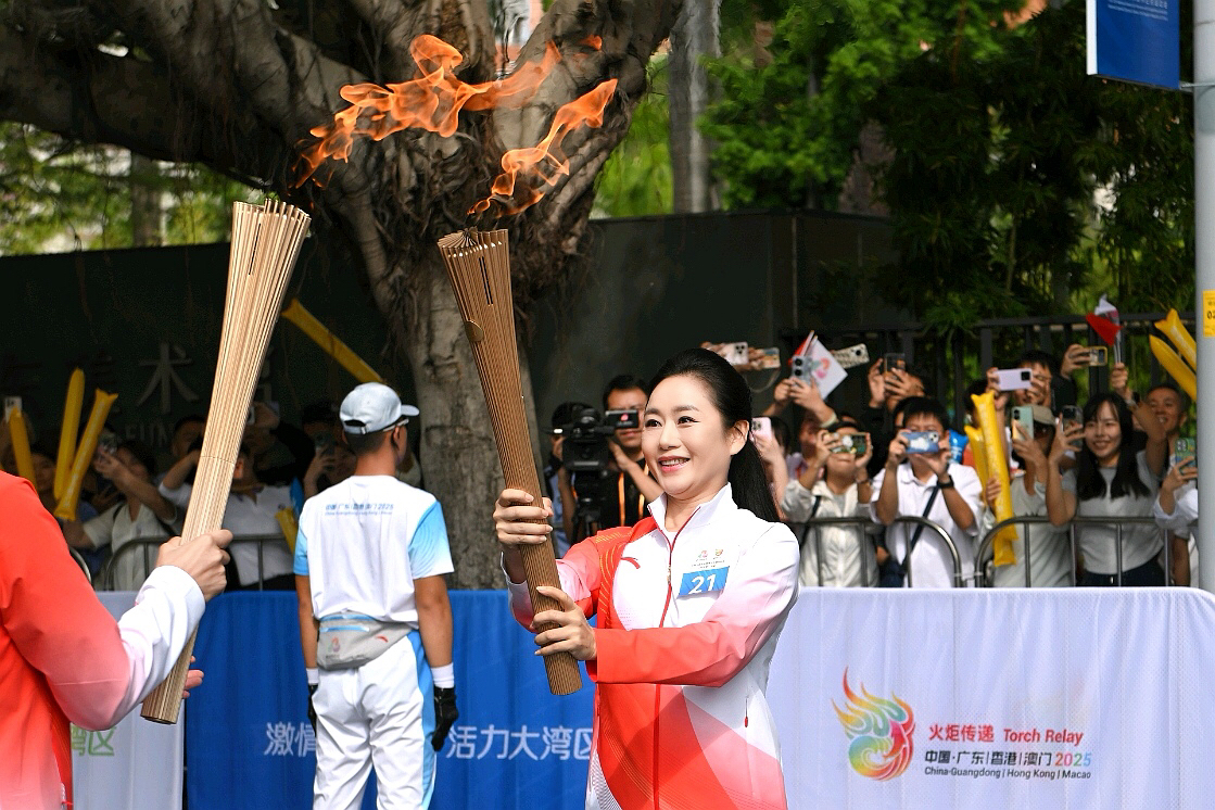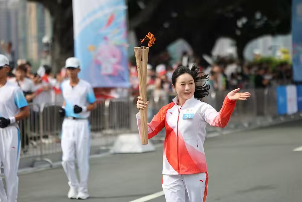 在热情的欢呼与掌声中,国家级非遗(粤剧)代表性传承人、粤剧表演艺术家曾小敏接过第十五届全国运动会火炬手的第21棒。她手持火炬,在明媚的风光与众人的注目中迈步奔跑,完成了属于她的荣耀传递。那一刻,飞扬的粤剧水袖与跃动的火焰交相辉映,传统艺术之美与体育精神完美融合。