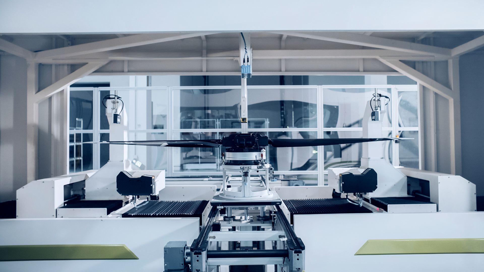 动力车间内,全球首条动力套合装检测线,开创电驱与桨叶合装的半自动安装及全自动检测的先河。