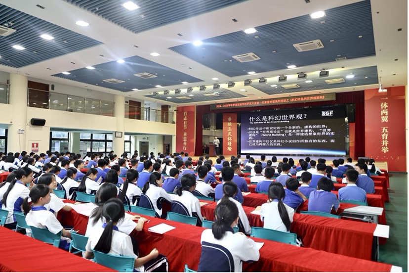 其中,马传思以“智能时代科幻的使命”为题,结合经典科幻作品为孩子们进行讲解;南翔在福中校园为高一年级学生带来《我的小说观》主题讲座,引导学生思考文学与成长的深刻联系;吴庆捷在福民小学带领孩子们领略语言艺术之美,引导他们用声音搭建心灵桥梁、用表达点亮成长之路;李亚威走进崛起实验中学,以“从尘土中筛出金屑”为题分享了她的电影和纪录片创作感悟,激发学生对当代社会发展主流价值的认同和社会责任感,并向学校捐赠其传记图书《让生命记录生命》和纪录片影片集《客家人》;谢晨以“生态文学与科幻小说的写作密码”为题,引导青少年在科学实证与推理的基础上写作,提升科学素养和人文精神……艺术家们走进课堂,化身“文化”摆渡人,以最大的热情、最拿手的绝活、最务实的行动,培养年轻一代对传统文化的认同和对新兴艺术的兴趣,引导他们从古今中外的文化瑰宝中启迪思维、富足精神、塑造灵魂。