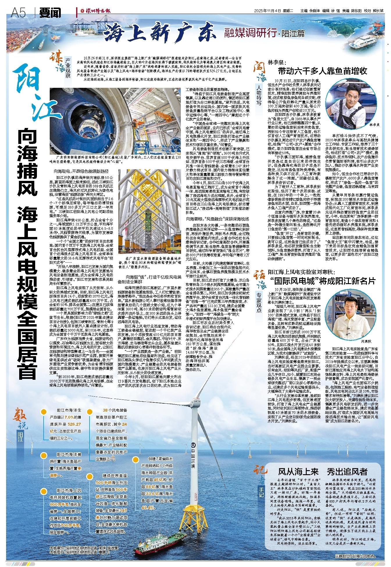 10月26日到31日,深圳报业集团“‘海上新广东’融媒调研行”报道组走访阳江。在南海之滨,记者看到一台台百米高的风电机组在阳江沿海巍然耸立,巨大的叶片在海风吹拂下缓缓旋转,将风能转化为粤港澳大湾区的清洁能源。