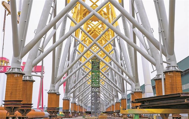 临海而建的阳江高新区,广东蓝水新能源装备制造基地现场,工人们忙着组装、焊接零部件。“现在是全年任务冲刺收官阶段。”蓝水新能源公司人事行政部经理李涛指着身后的几个庞然大物介绍,这九个单体重1600吨、高80米的钢结构塔管架依次排列在外场上,在300米远的码头上停靠着一条运输船。它们将从这里出发,运往远海的风电场。