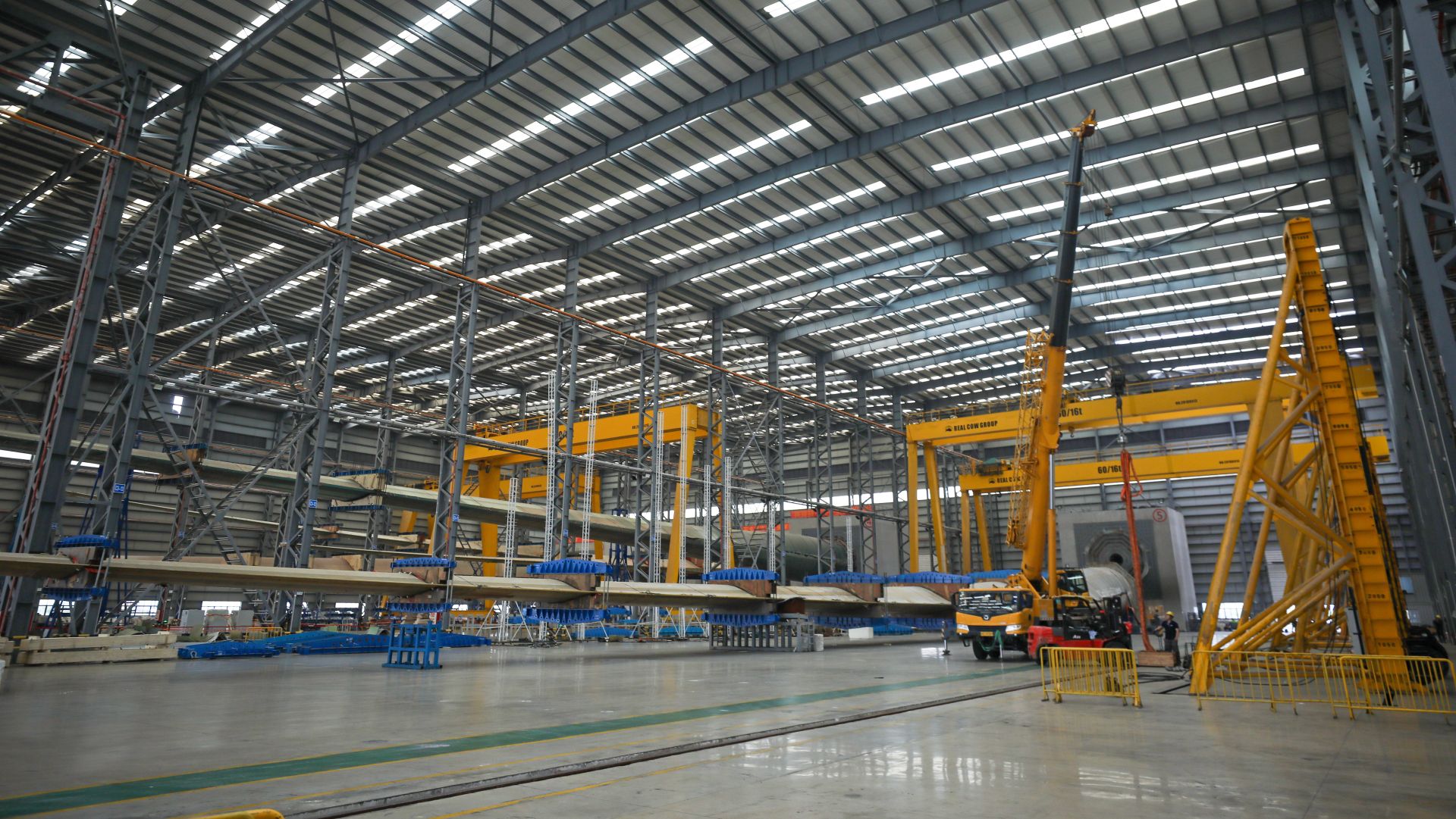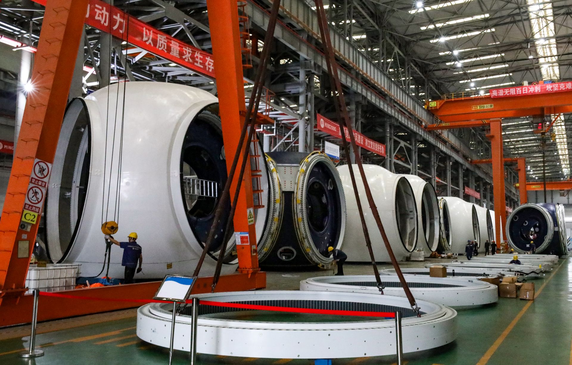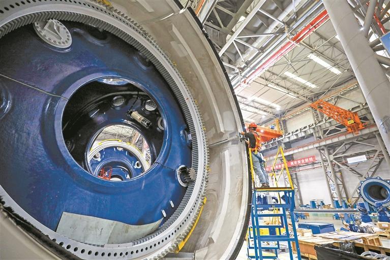 广东明阳新能源科技有限公司(阳江基地)总装厂车间内,工人们正在组装重达130吨的巨型轮毂,它是风电机组传输动力的“心脏”。