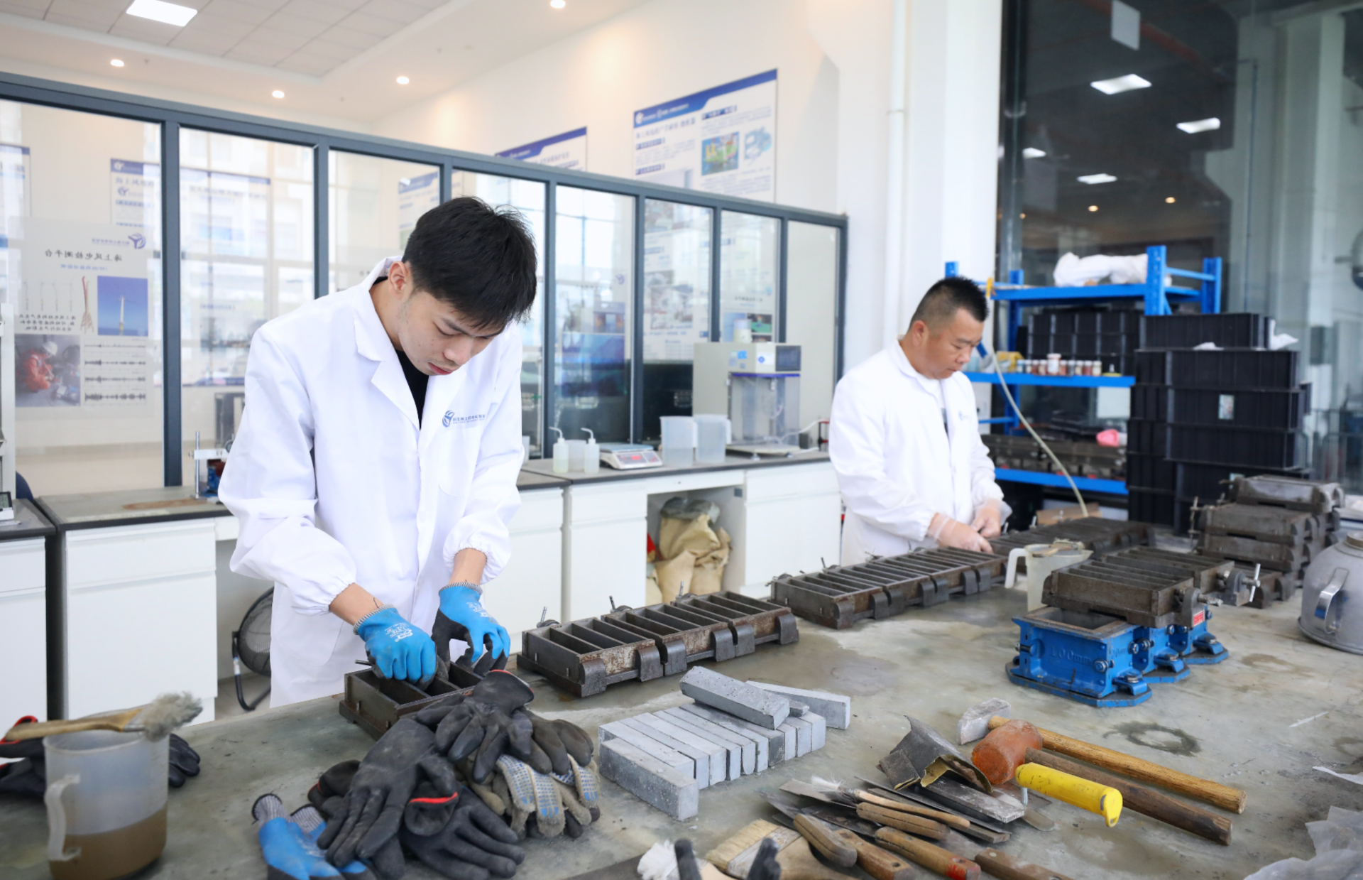 阳江风电实验室实验人员正在进行灌浆材料试件制作前的模具组装工作。