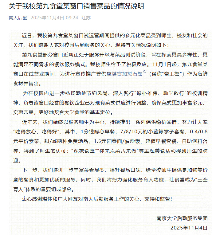 情况说明中提到,近日,该校第九食堂某窗口试运营期间提供的多元化菜品受到师生、校友和社会的关注。该食堂部分窗口近期正处于服务升级与菜品测试阶段,旨在探索更具多样性、更能满足不同需求的餐饮服务模式。11月1日起,某窗口在试营业期间,为进行宣传推广曾供应堪察加拟石蟹(俗称“帝王蟹”)作为海鲜食材并售出。