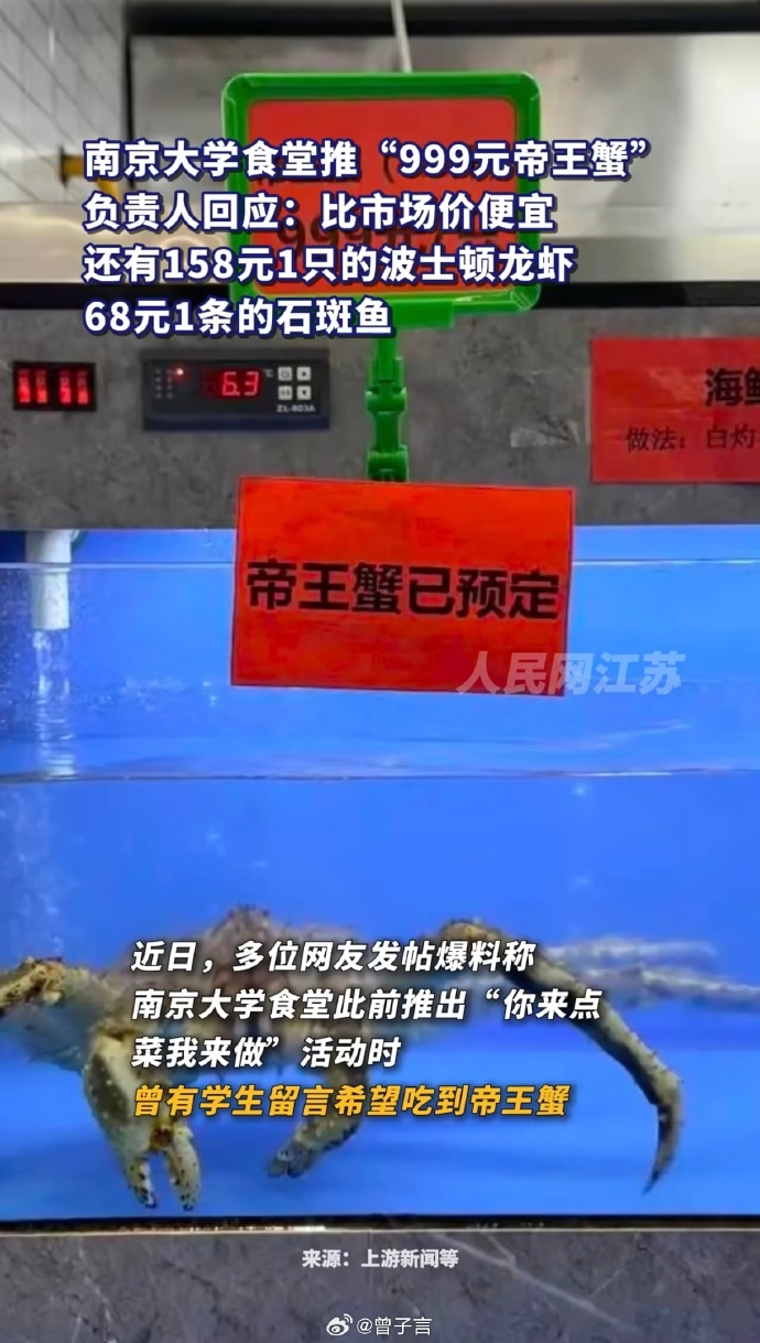 近日,南京大学仙林校区第九食堂供应“999元一只帝王蟹”一事引发广泛关注。