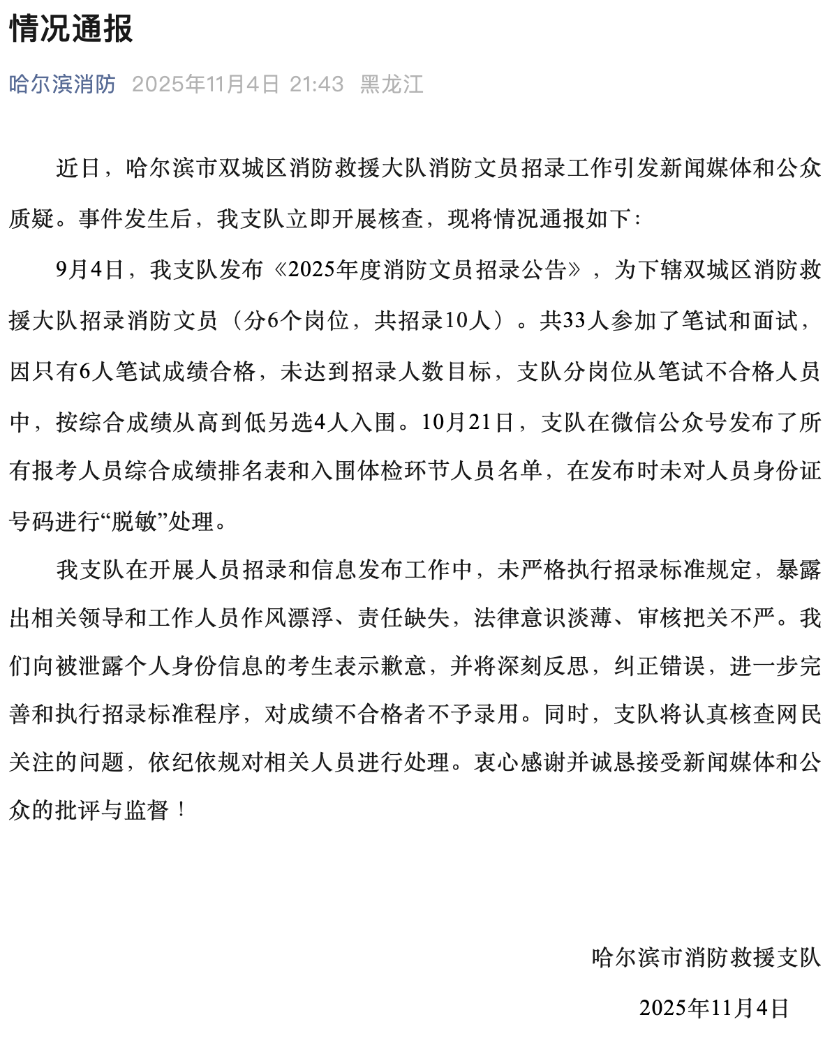 11月4日晚,哈尔滨市消防救援支队发布情况通报表示,该支队在开展人员招录和信息发布工作中,未严格执行招录标准规定,暴露出相关领导和工作人员作风漂浮、责任缺失,法律意识淡薄、审核把关不严。