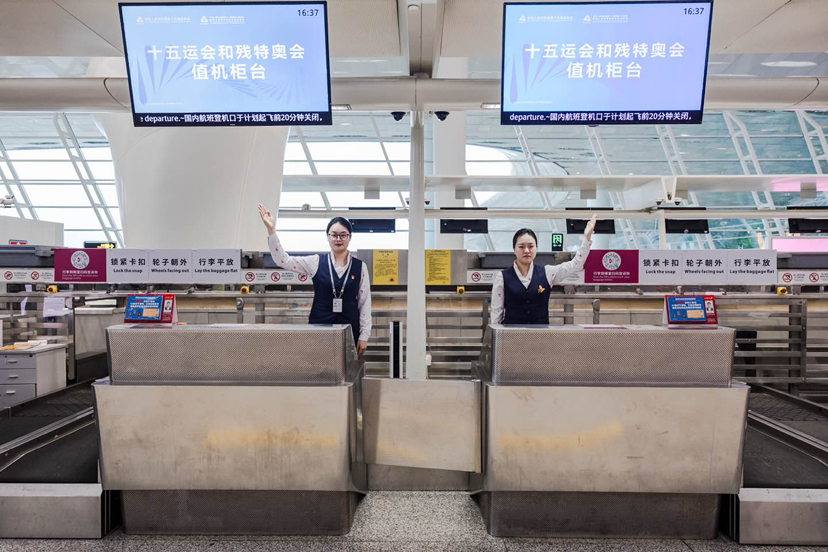 地面服务是旅客体验的第一站。深航成立专项保障工作组,每日梳理涉赛航班计划,通过专项群实时传递信息,做到“专人专岗、重点盯防”。设立“赛事绿色值机柜台”,由骨干人员提供值机、行李托运“一站式”引导;启用“十五运”定制登机牌与行李条,实现行李全流程精准管理;针对特殊旅客,提供全程陪伴服务;国际近机位航班安排专人持牌接机,全程引导至专属行李转盘。行李提取环节更显温度,设立轮椅专属交接区与赛事行李专用转盘;对赛事的特殊用具超大、易碎物品,实行“一对一专属交接”,确保赛事用具安全、高效流转。