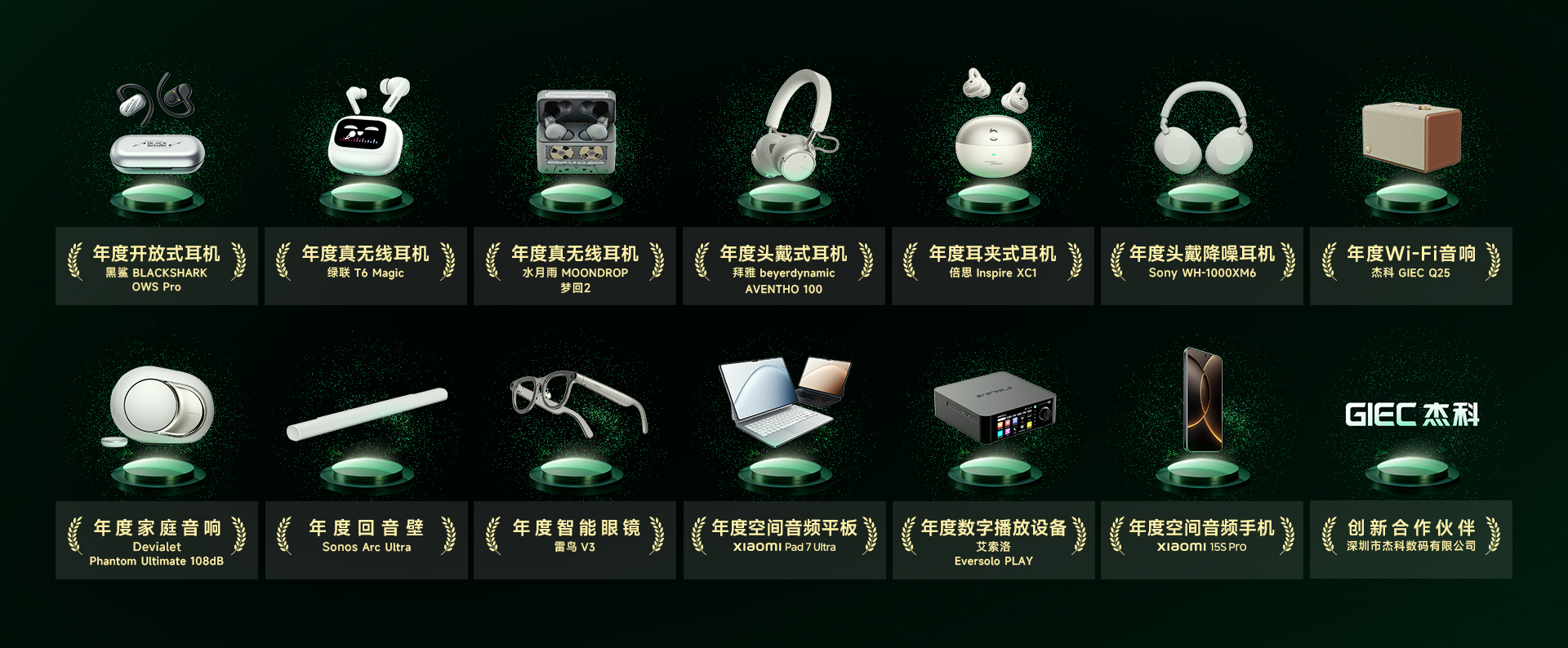 在本届大赏的评选中,中国电子音响行业协会指导构建了“客观硬件测试+权威主观听感”综合评审体系,特别邀请到数位“鉴音团”评审代表出席,对已获得“臻品音质认证”的近40家品牌、100多款产品进行二次遴选。最终14款音频产品及品牌脱颖而出,荣获“2025 QQ音乐臻享奖”,获奖名单如下: