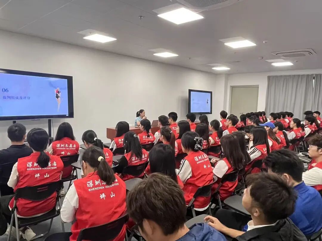 在坪山区迎接赛事的热烈氛围中,深圳技术大学的志愿者“小海豚”们如温暖春风般入列,这群平均年龄仅19岁的青年力量,带着“为你,更精彩”的坚定信念,为艺术体操赛事增添最美底色。赛前,“小海豚”们投入了全面且细致的培训。礼仪老师一对一耐心教导每个手势,他们在场馆里反复模拟,不放过任何细节;硬核专业知识学习时全神贯注,消防演练中技能点逐个加满。每一个看似细碎的瞬间,都因他们的专注而熠熠生辉。