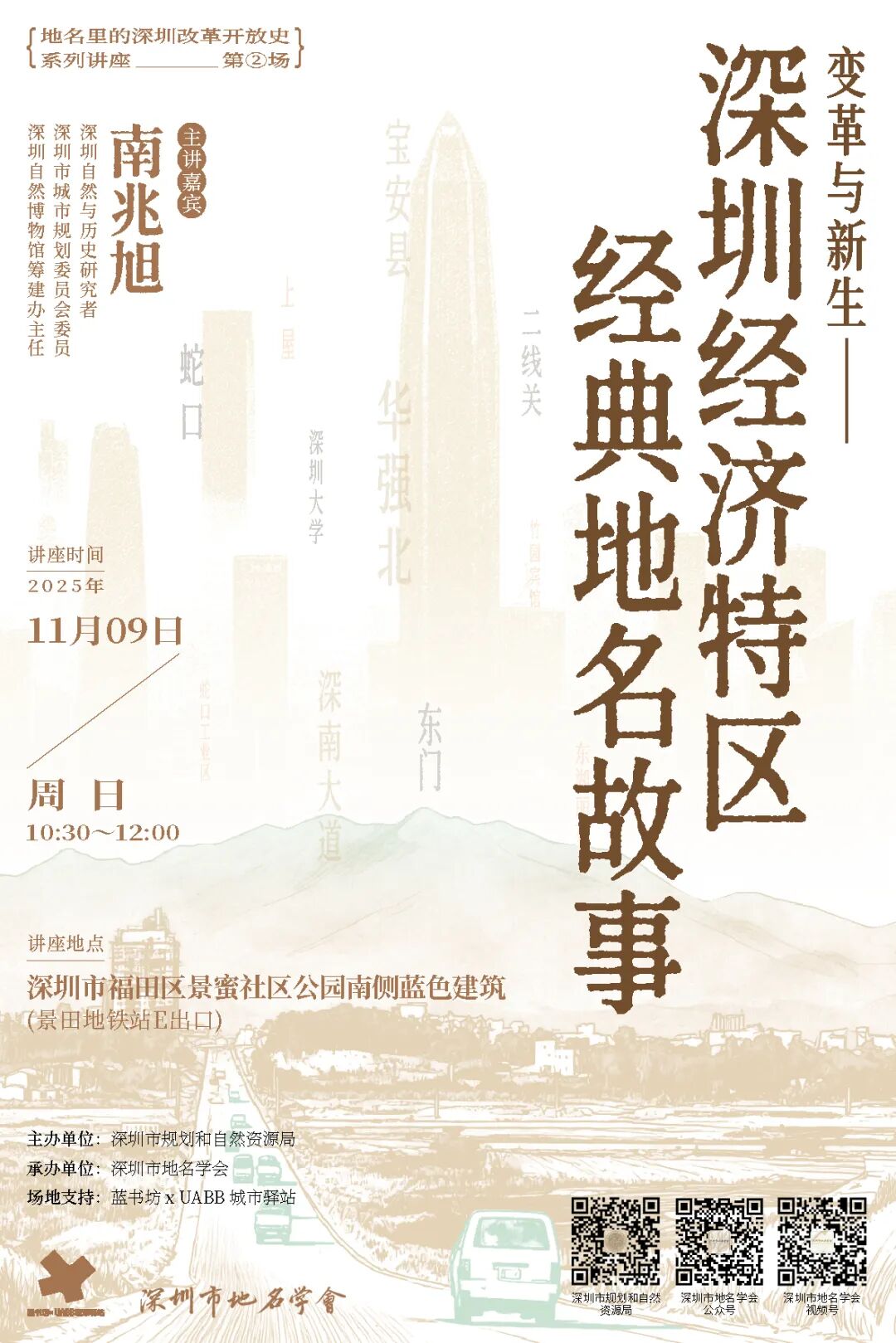 11月12日(周日)上午10:30,由深圳市规划和自然资源局主办、深圳市地名学会承办的“地名里的改革开放史”系列讲座第二期,将在福田区景田路景蜜公园蓝书坊×UABB城市驿站举办。深圳知名自然与历史研究者、深圳市城市规划委员会委员南兆旭,将以精彩的“变革与新生——深圳经济特区经典地名故事”主题讲座,唤醒你的青春记忆。