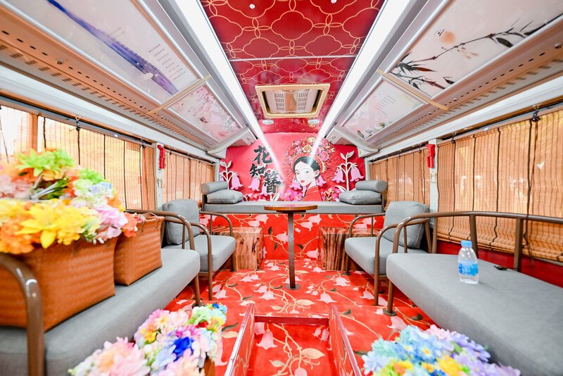 “婚庆巴士”满载城市的温情,一层演绎岭南传统婚俗的典雅,二层铺陈现代浪漫的温馨,与窗外绚丽的簕杜鹃相映成趣。创新打造出一个移动的幸福空间,让传统与现代在车轮上交融。