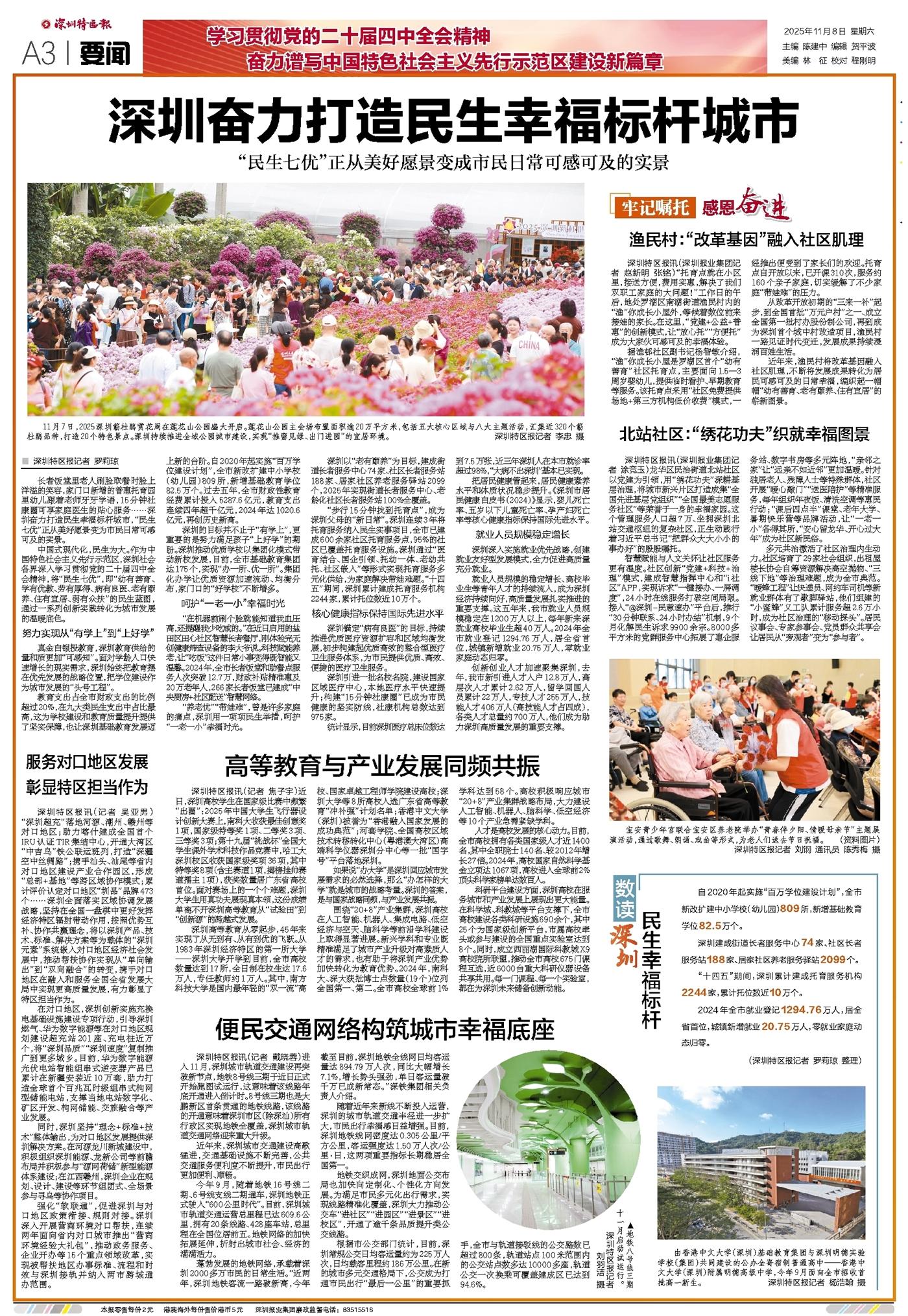 长者饭堂里老人刷脸取餐时脸上洋溢的笑容,家门口新增的普惠托育园里幼儿跟着老师牙牙学语,15分钟社康圈可享家庭医生的贴心服务……深圳奋力打造民生幸福标杆城市,“民生七优”正从美好愿景变为市民日常可感可及的实景。