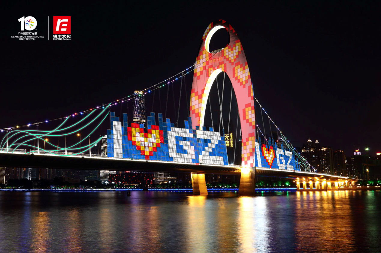 记者注意到,分会场灯光作品也已经陆续亮灯,可以说各有各的精彩!彩虹色的视觉色彩与高科技光影艺术结合,形成丰富的灯光作品,展现出新时代广州城市的出新出彩。