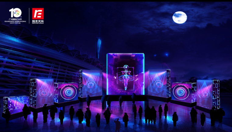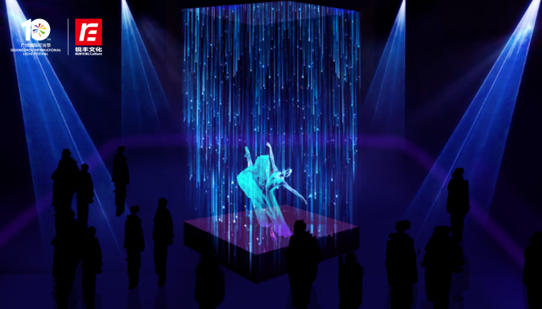 花城广场南广场上,一座硕大的中国传统建筑,覆盖着巨幅透明冰屏。这座被命名为“时空·共生”的灯光作品,出自广州美术学院跨媒体学院院长冯峰之手,也是本次广州国际灯光节的C位作品。四季变幻的视觉主题,呈现出时空流动之美,为灯光节定下了艺术氛围浓厚的基调。作品总高13米8,分为三层,并安装巨幅透明冰瓶,和轨道装置,在展示过程中,能够实现开合。冯峰介绍,时空·共生”将声光电新技术运用到了艺术创作中,在一个固定公共艺术作品中,营造出一个剧场化的展示空间,并融入灯光与公众互动,观众可以走近作品,成为艺术作品重要组成部分。