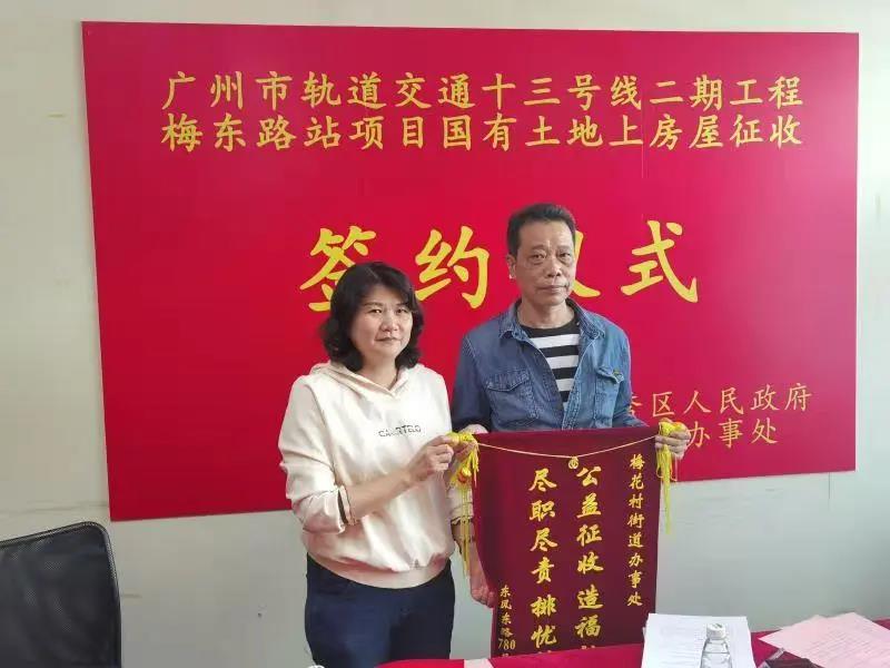今日,记者从广州市越秀区梅花村街获悉,街道地铁十三号线梅东路站项目房屋征收补偿签约已经开始,首批拆迁户签约。