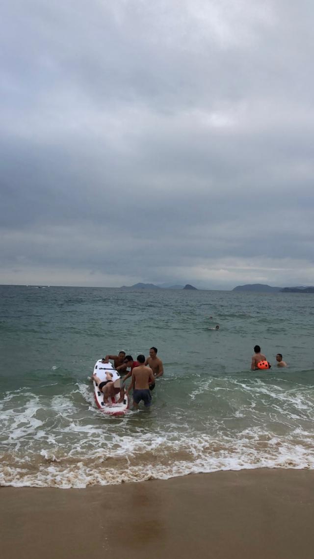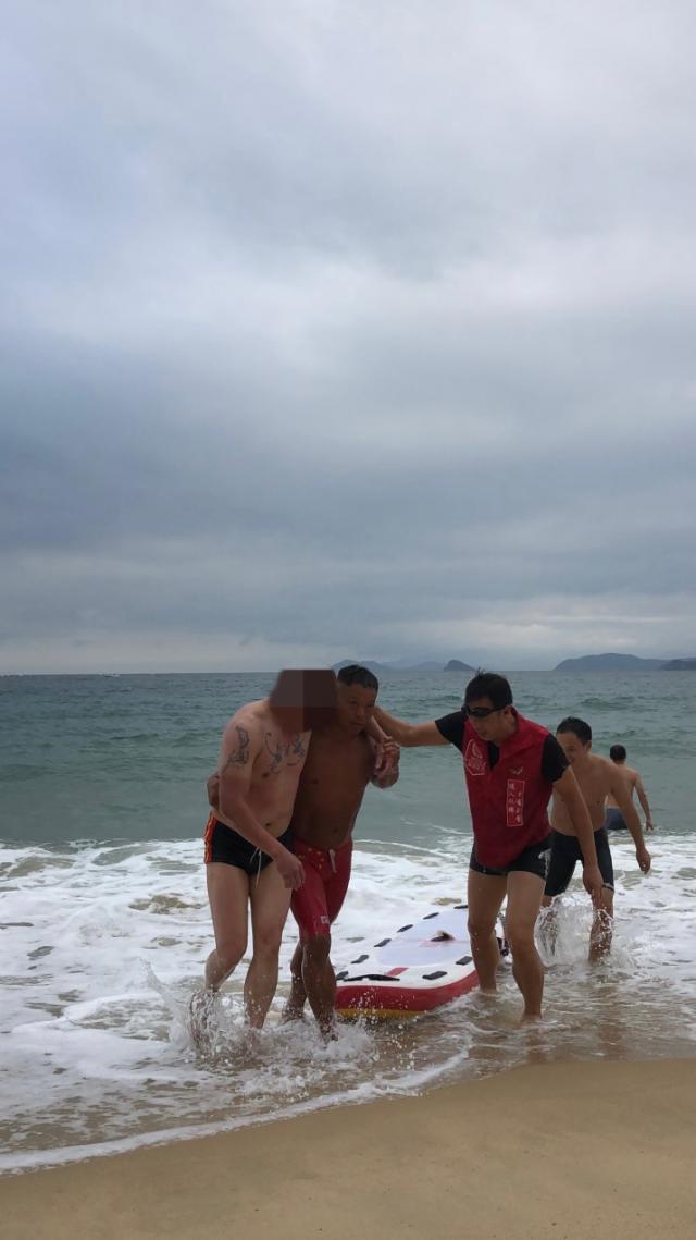 彭卫华发现该男子头沉海里,手举出水面,正在挣扎,凭着多年的救援经验,彭卫华立即将其拉上桨板,送往岸边,由大梅沙救生员确认其身体情况。