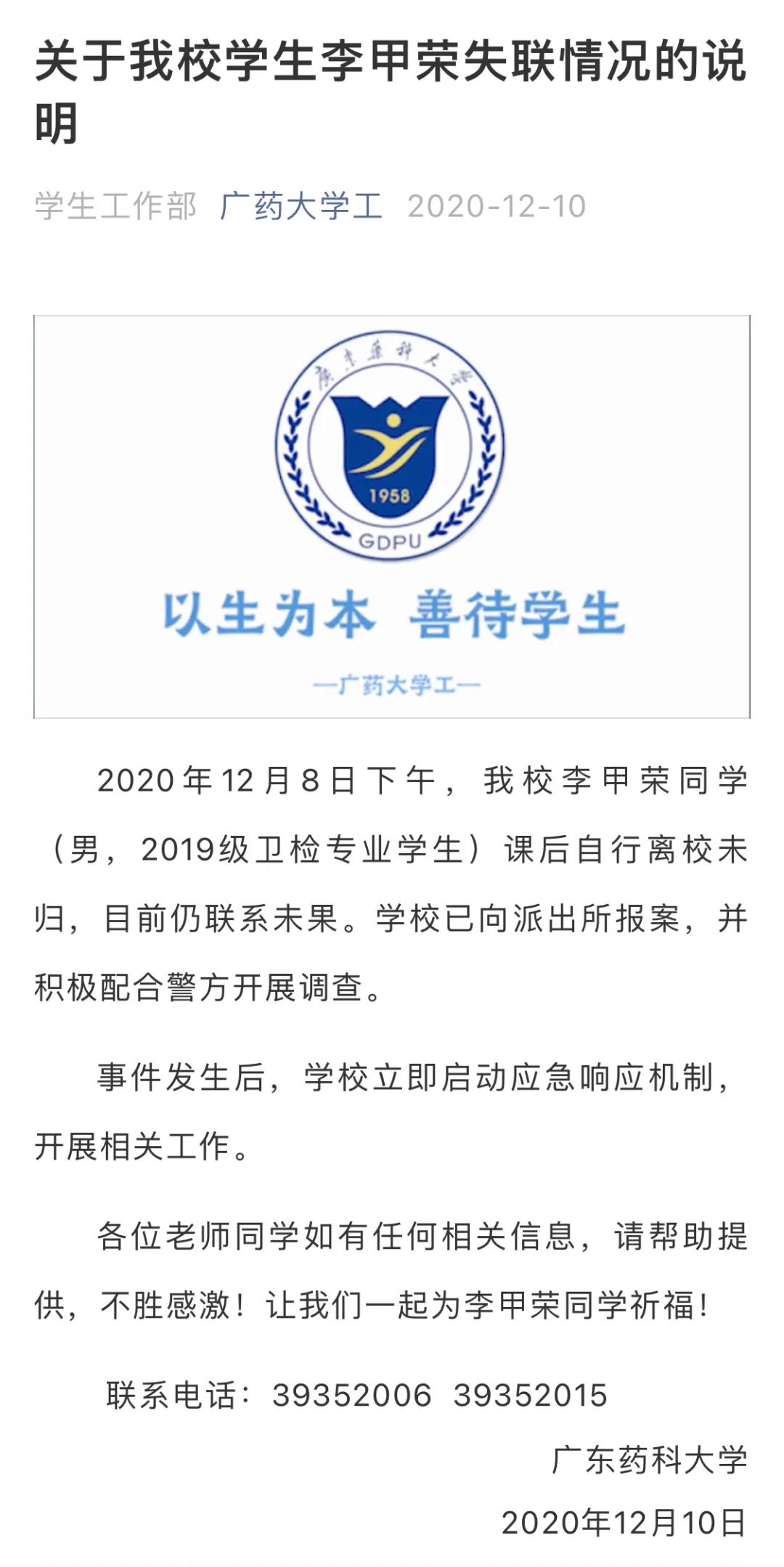 据广东药科大学学生工作部12月10日发布的官方消息,广东药科大学一名学生(男,2019级卫检专业学生),从12月8日下午课后离校至今未归