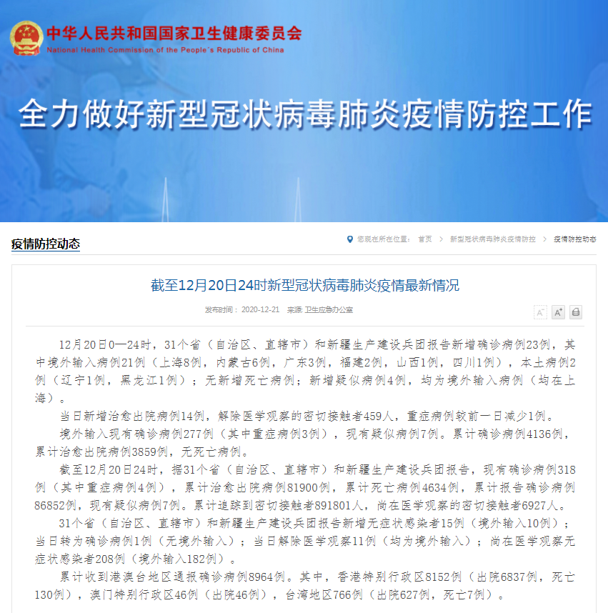 截至12月20日24时新型冠状病毒肺炎疫情最新情况