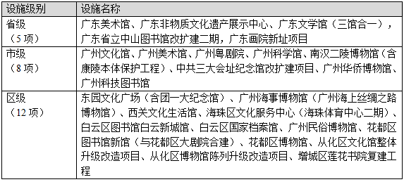 省级重点文化设施项目2项:分别为广东人民艺术中心,广东文物保护科技中心。