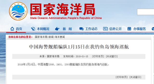 2018年1月15日,中国海警2308、2401、2303舰船编队在我钓鱼岛领海内巡航。
