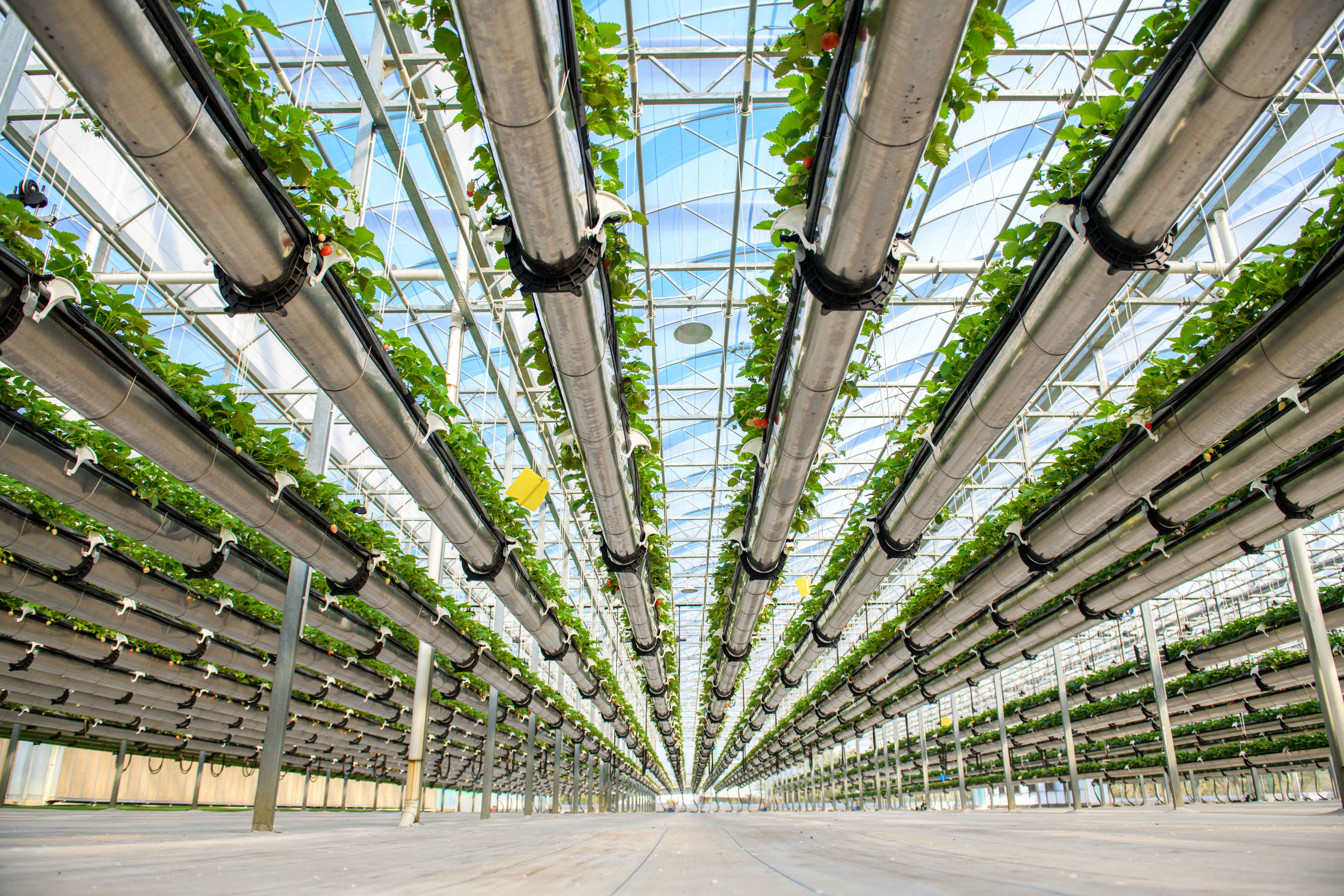 在120多条近百米长的培养槽内,一颗颗鲜艳的草莓从绿叶与藤蔓中探出头来,偶尔冒出的一朵洁白小花消散了冬日的寒意。