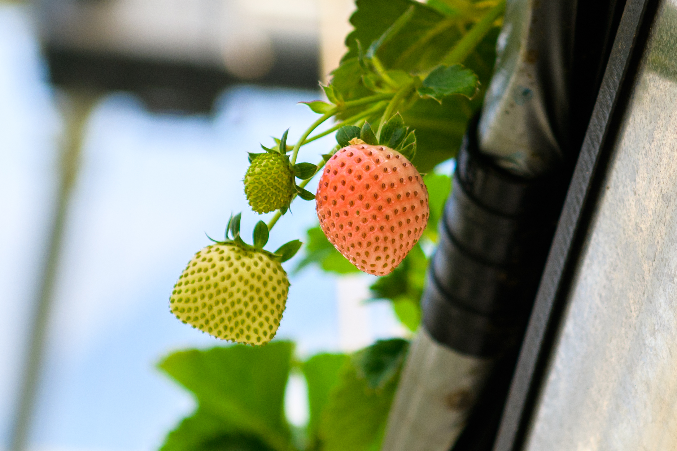 公司技术总监安飞告诉记者,今年草莓园的品种主要是红草莓系列中的清香、香野、越秀和白草莓系列中的白雪公主等。除此之外,今年草莓园还首次引入国内自主研发的粉色草莓“粉玉”。记者在培养槽内见到,零星几颗粉玉草莓还未成熟,但已露出些许粉色,在藤上轻轻摇晃甚是可爱。